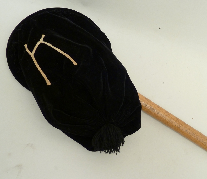 Collectezak met kort hengsel, met geborduurde K (kerk)
