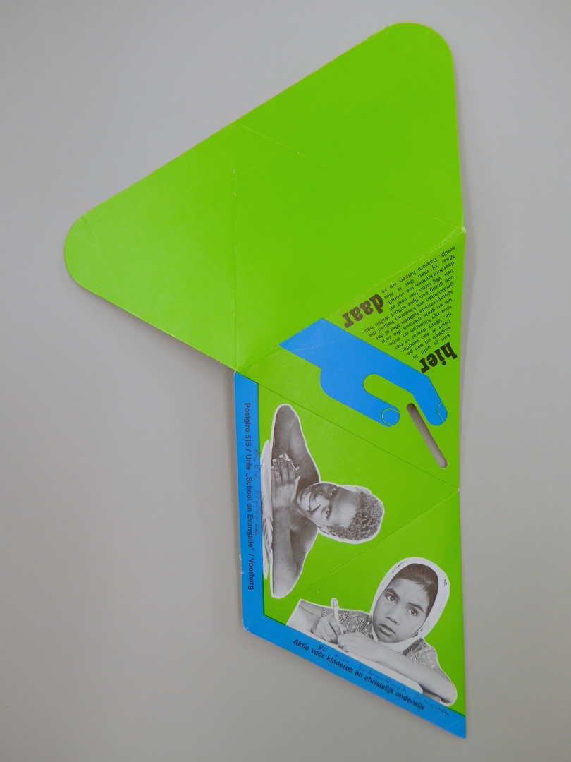 Propagandamateriaal "Unie School en Evangelie": blauw-groene spaarpot