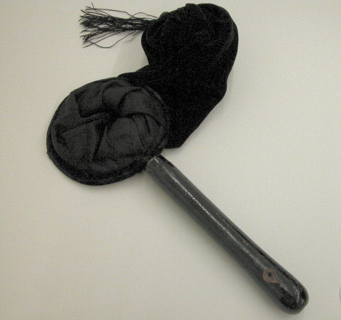 Zwarte collectezak met korte steel, met twee haakjes en kwast