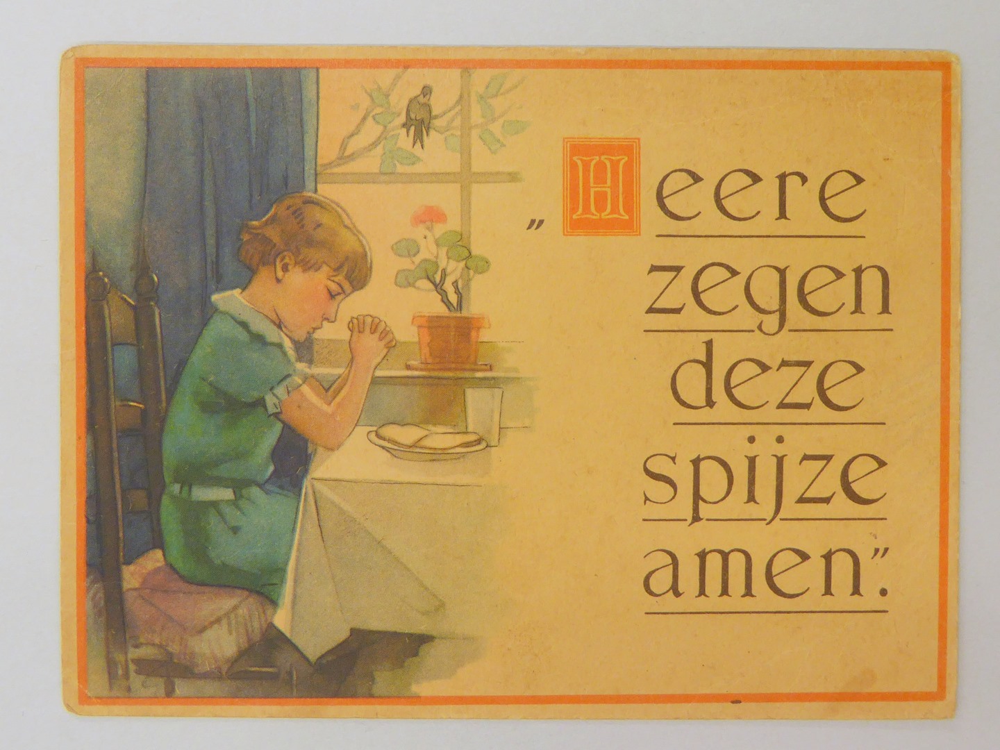 Prentbriefkaart met biddend meisje aan gedekte tafel, met "Heere zegen deze spijze amen"