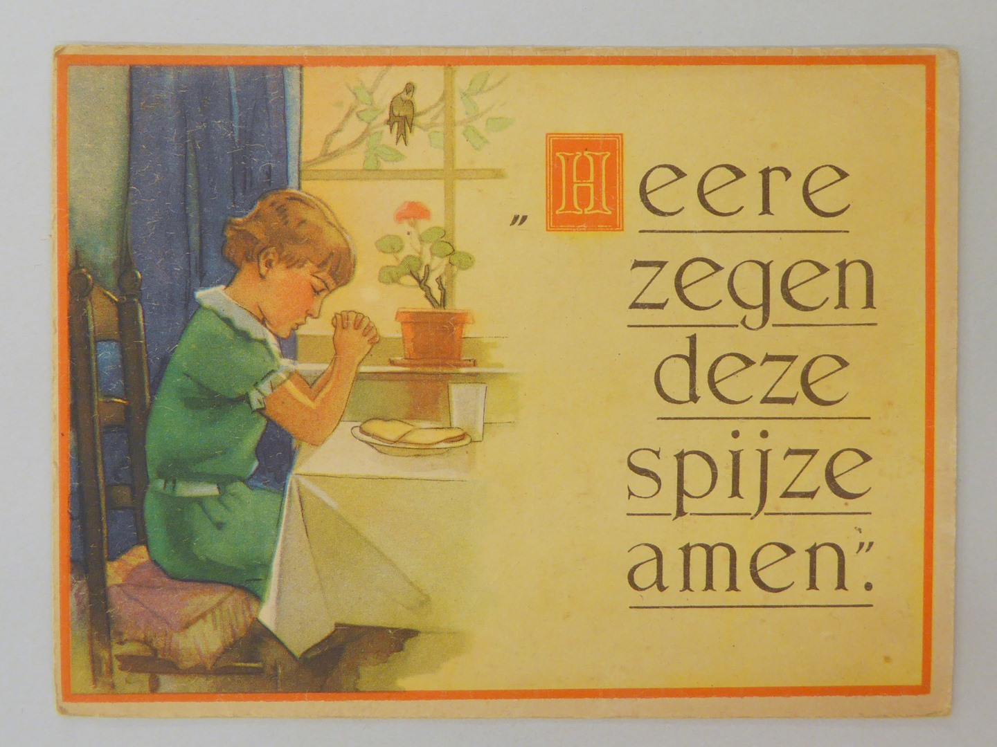 Prentbriefkaart met biddend meisje aan gedekte tafel, met "Heere zegen deze spijze amen"