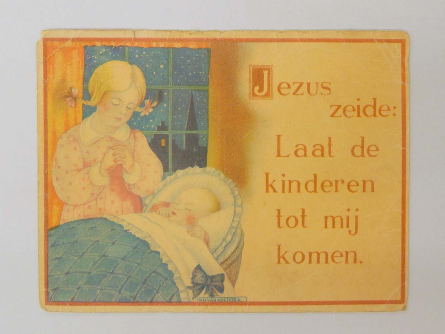 Prentbriefkaart met zusje en kindje in wieg, met "Jezus zeide: Laat de kinderen tot mij komen."
