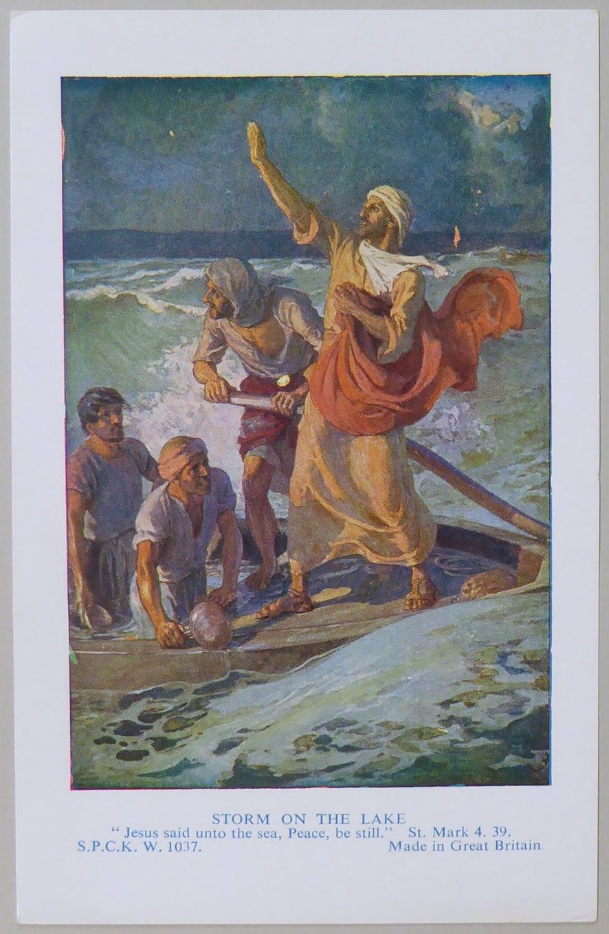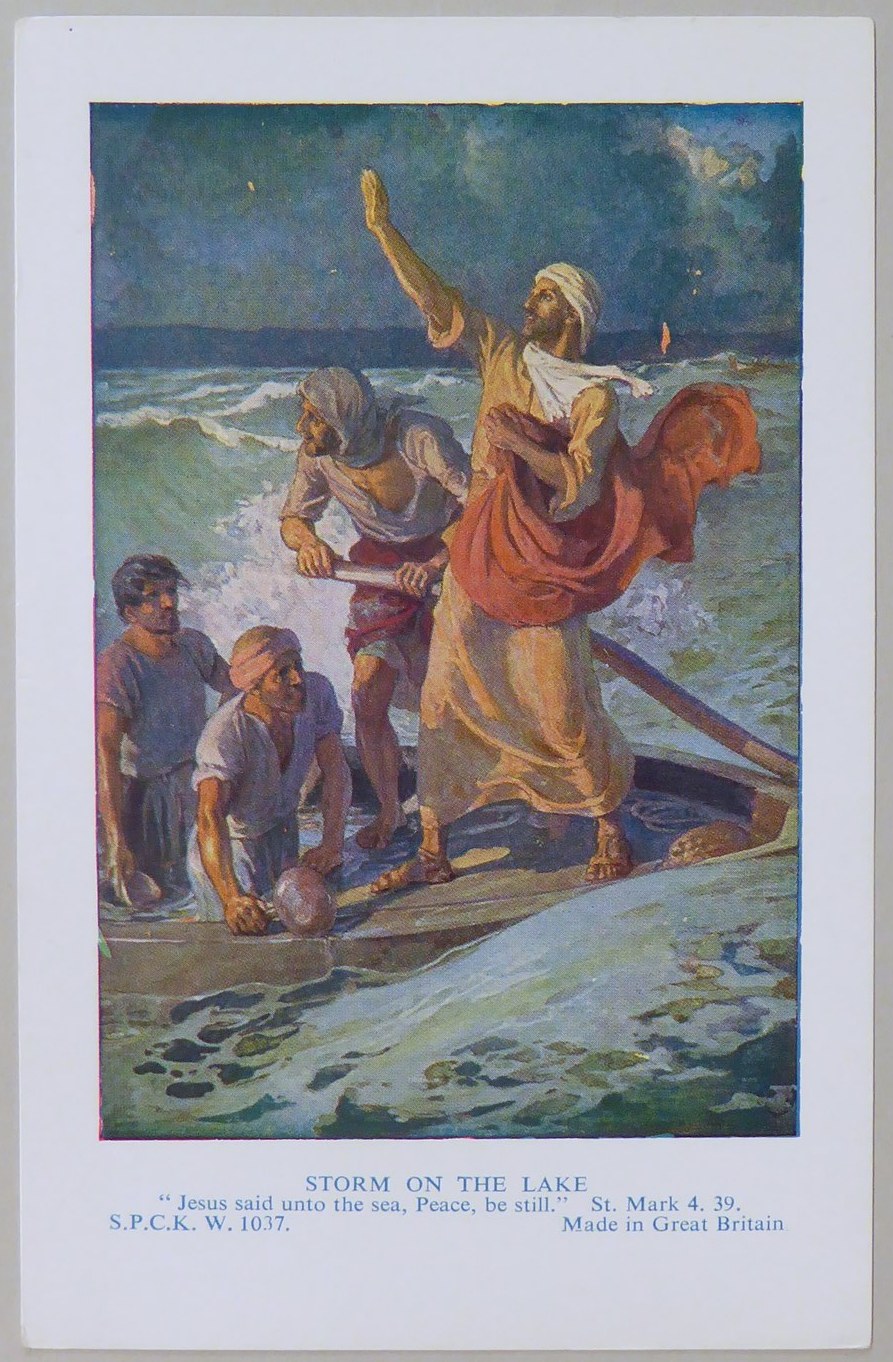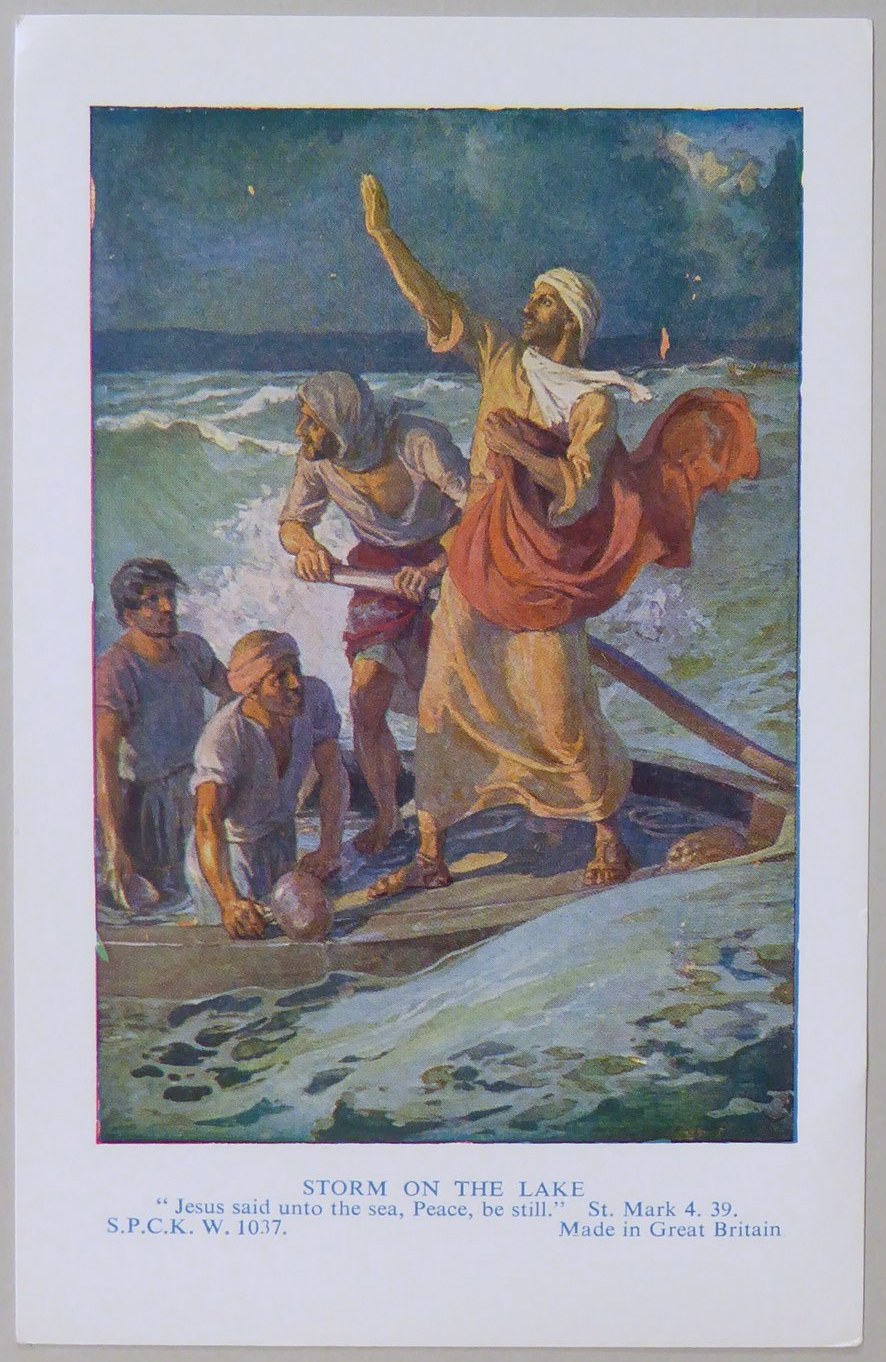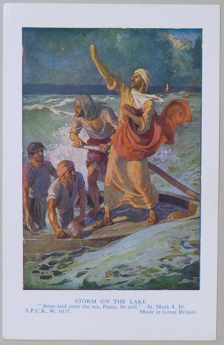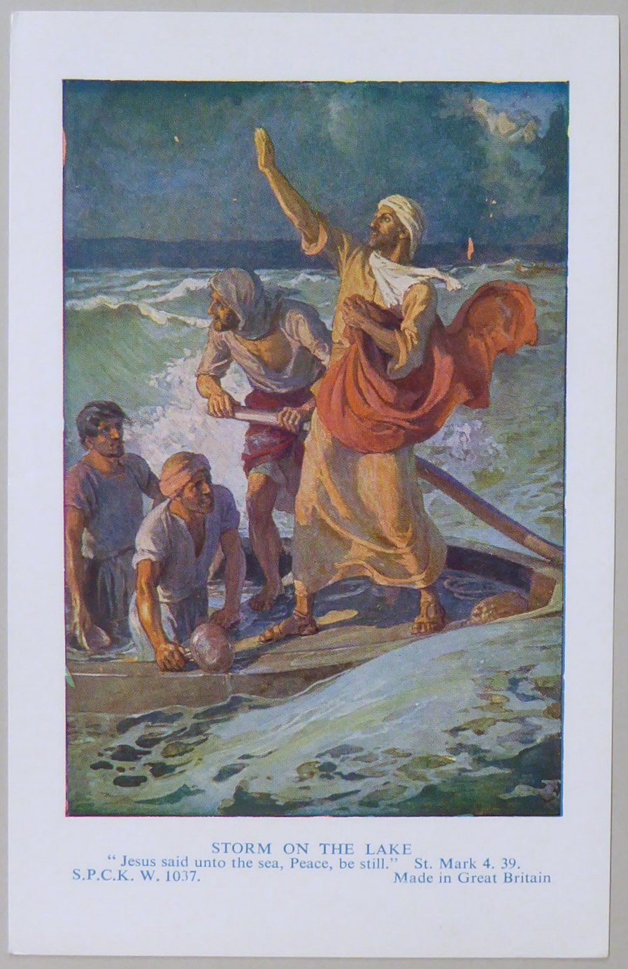 Beloningsplaatje (14 stuks) met Jezus en zijn discipelen bij de zee, met "Storm op het meer"