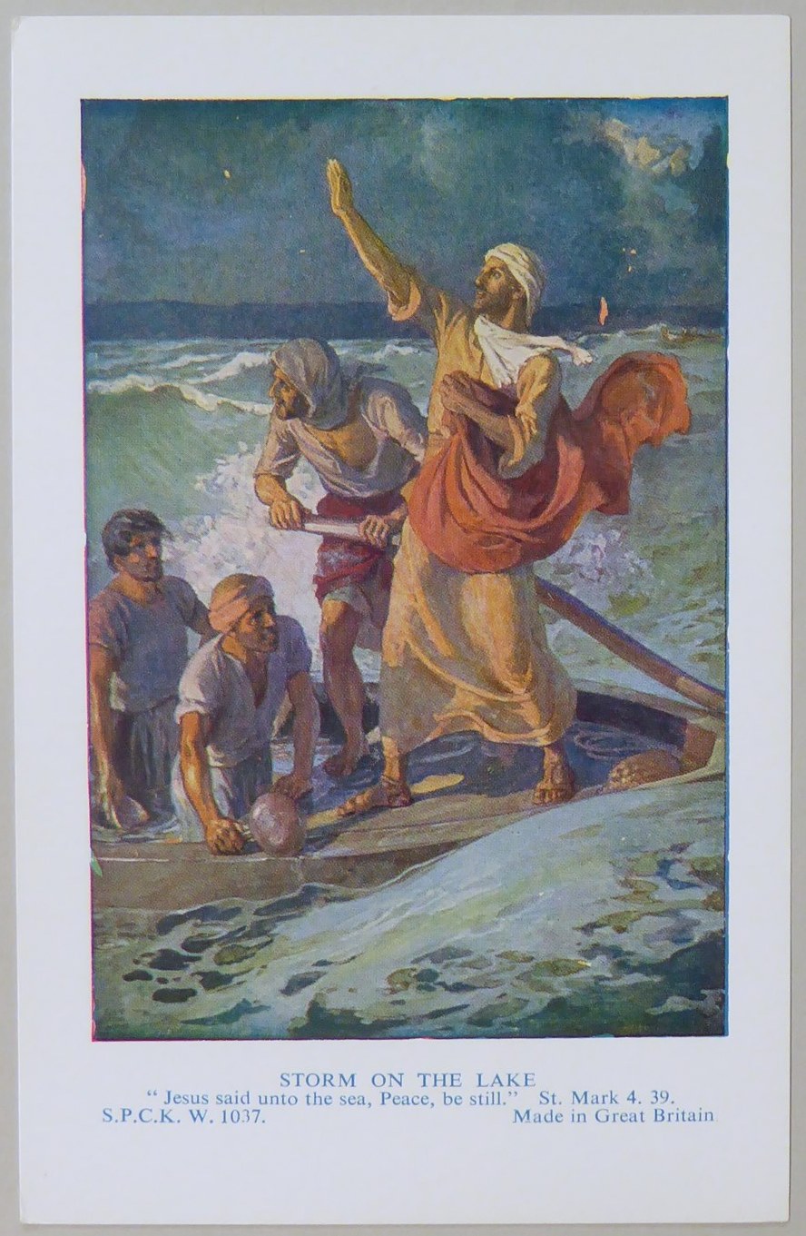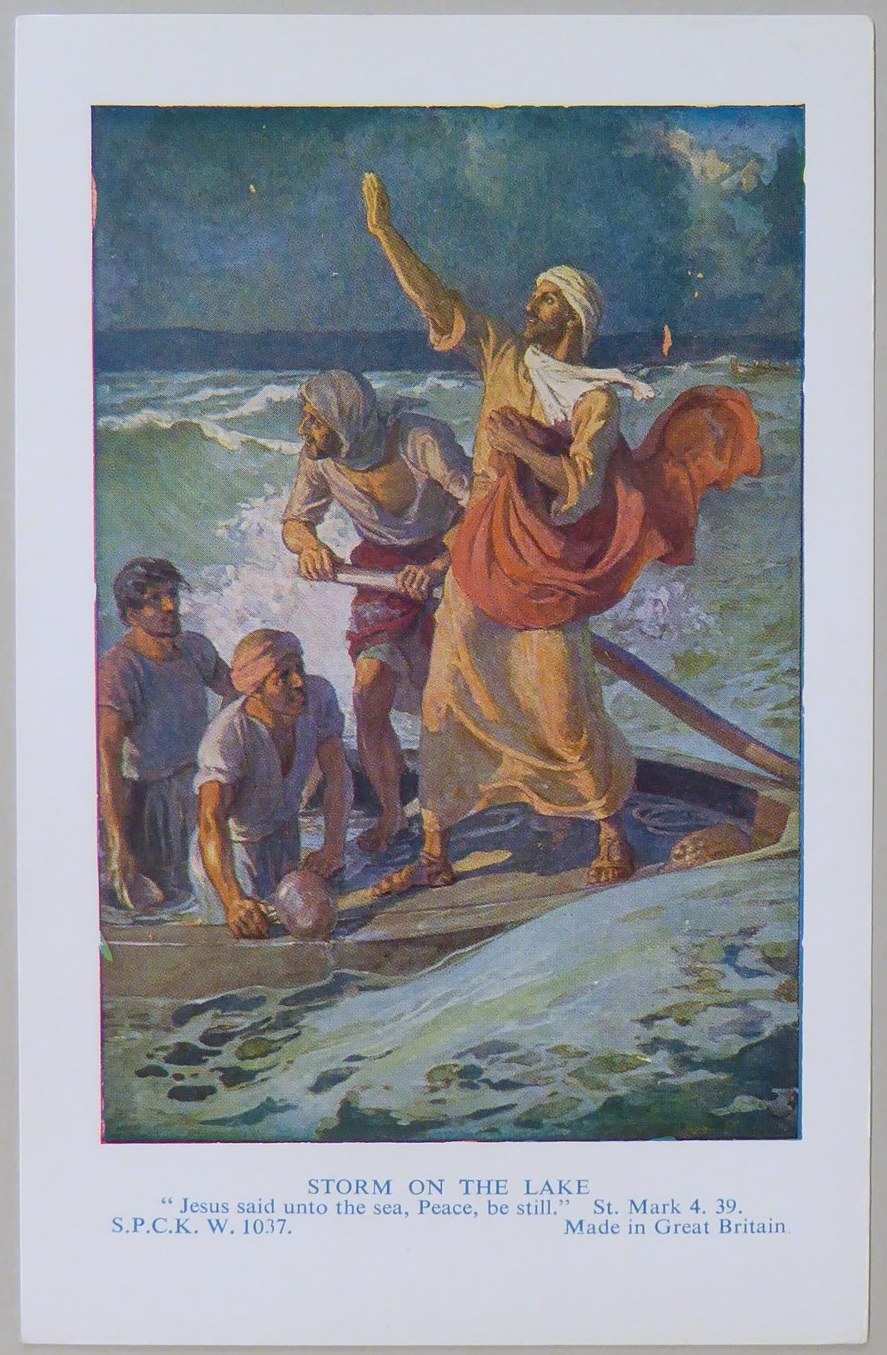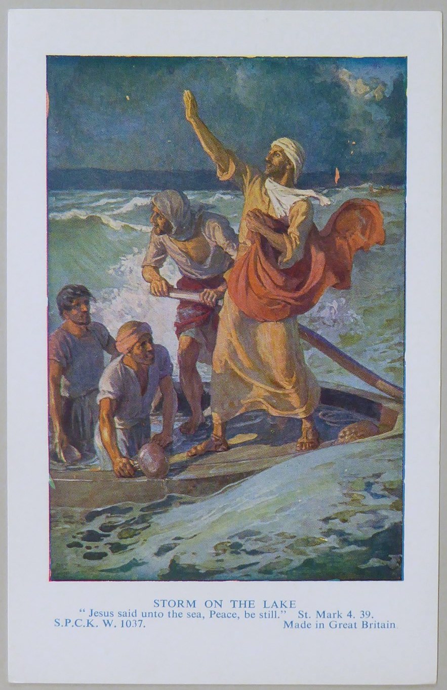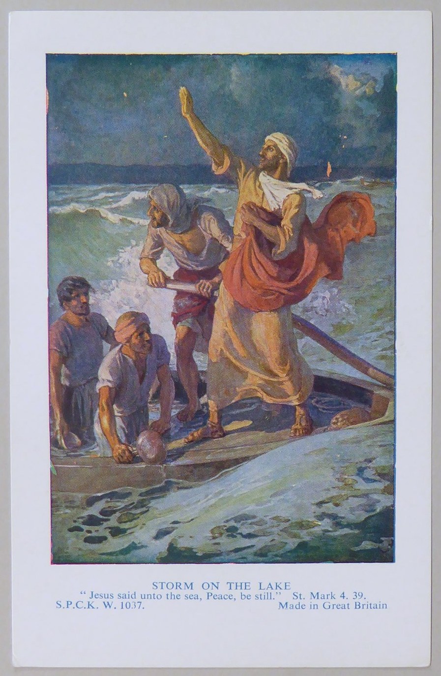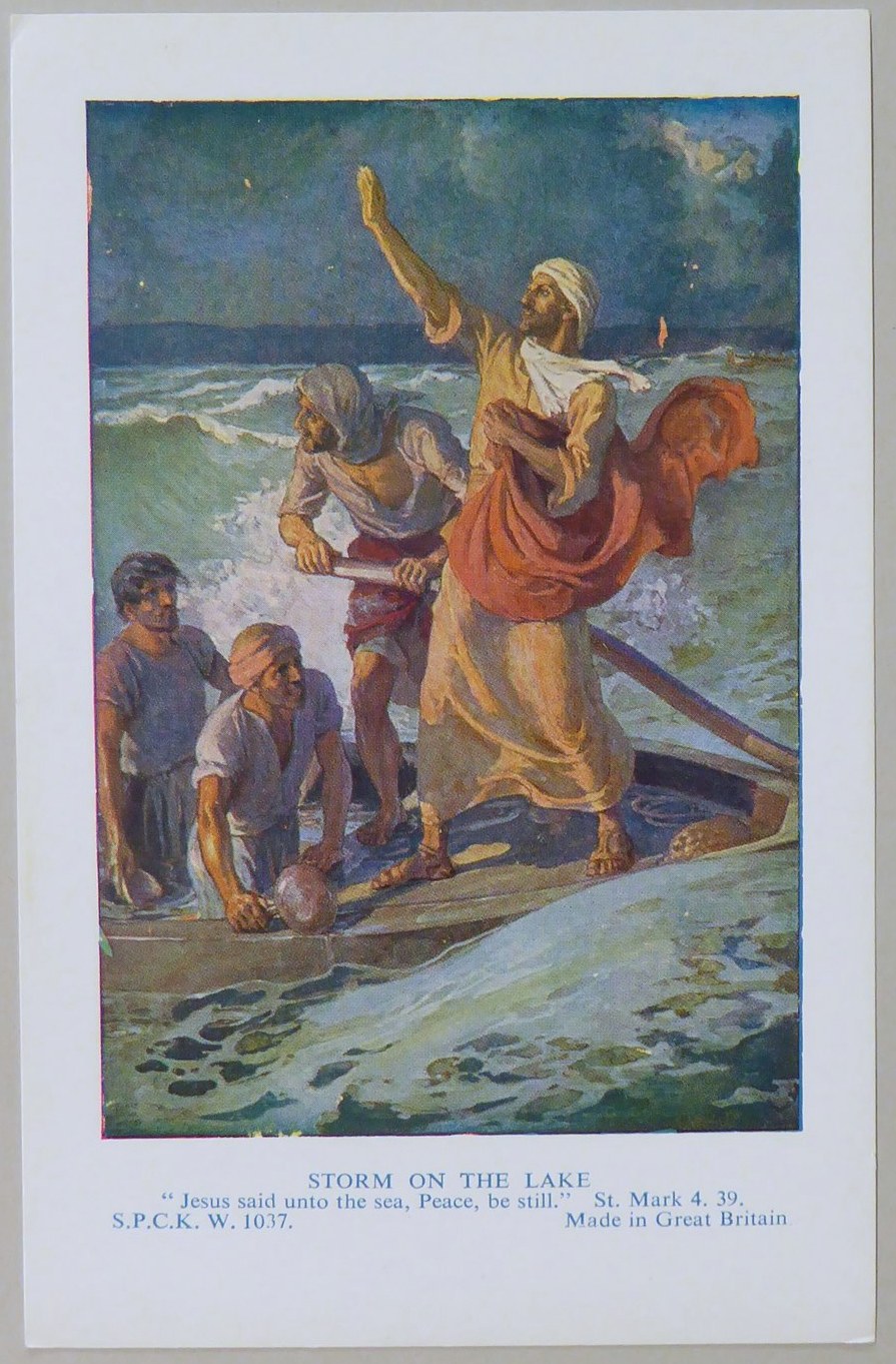 Beloningsplaatje (14 stuks) met Jezus en zijn discipelen bij de zee, met "Storm op het meer"