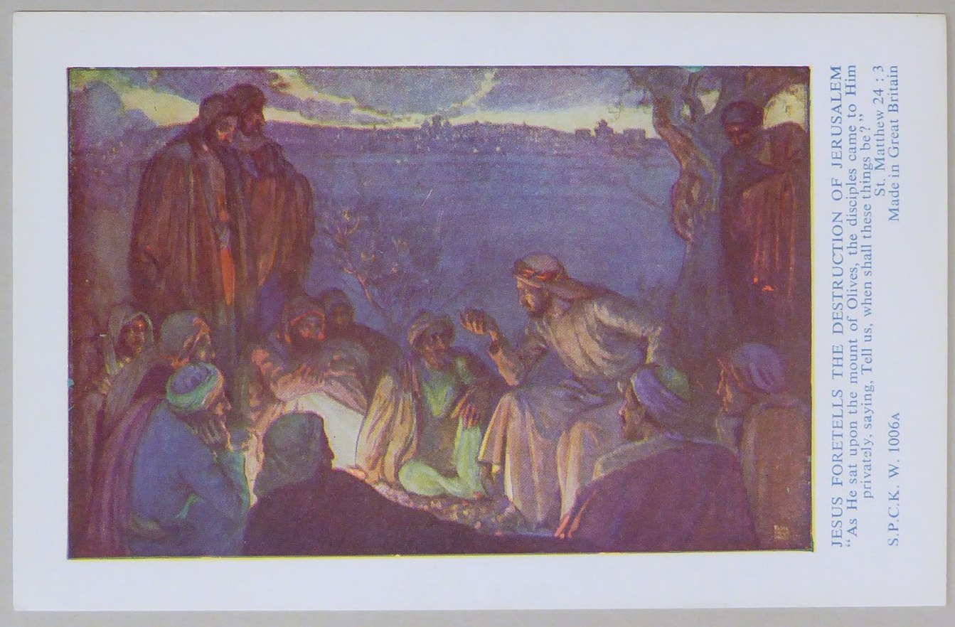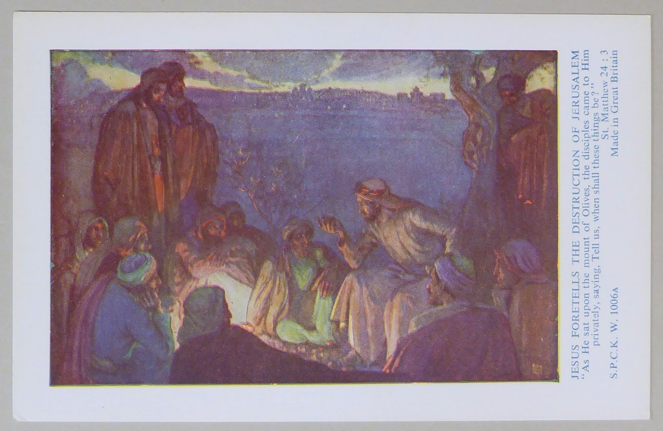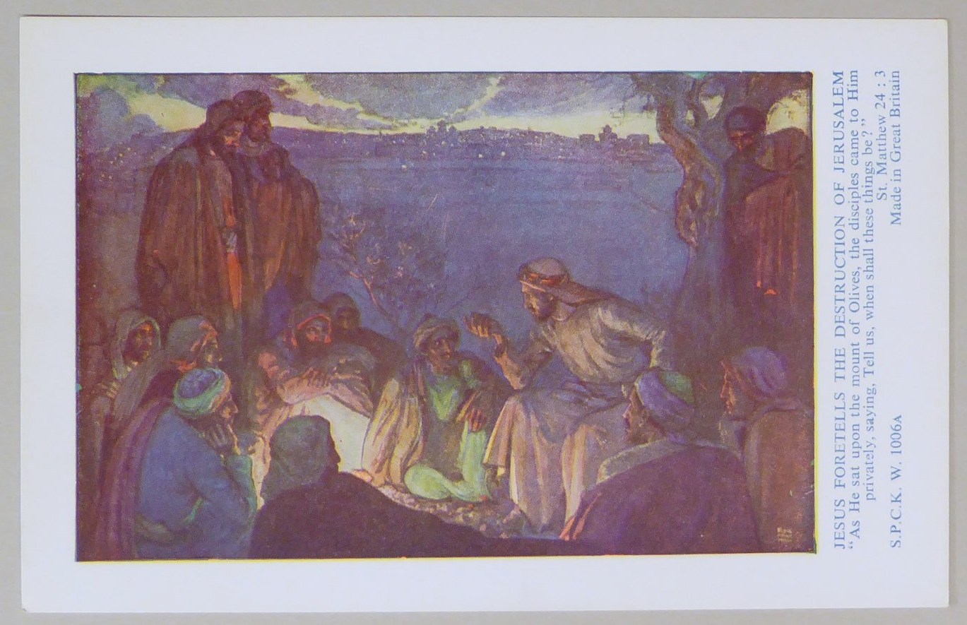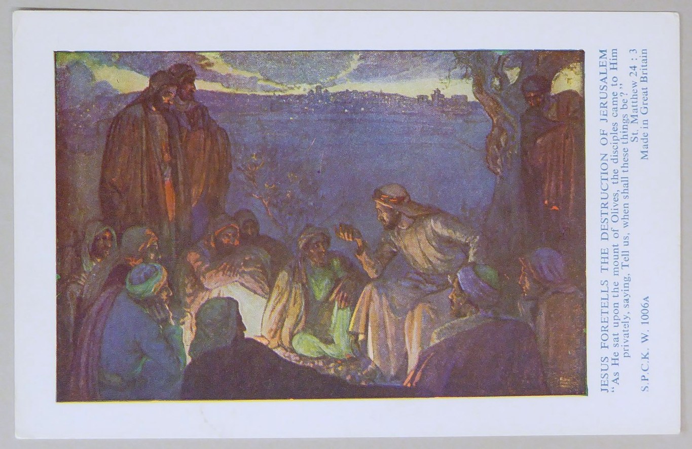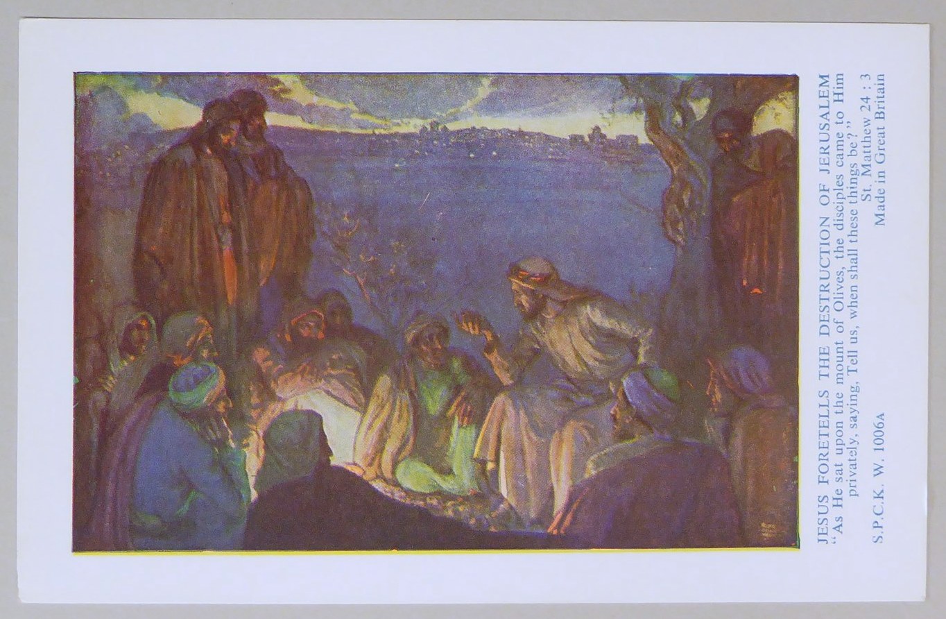 Beloningsplaatje (15 stuks) met Jezus en de discipelen, met "Jezus voorspelt de verwoesting .."