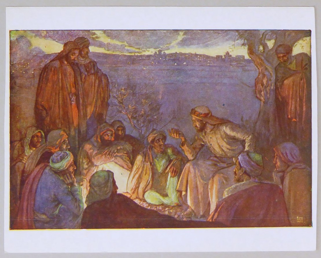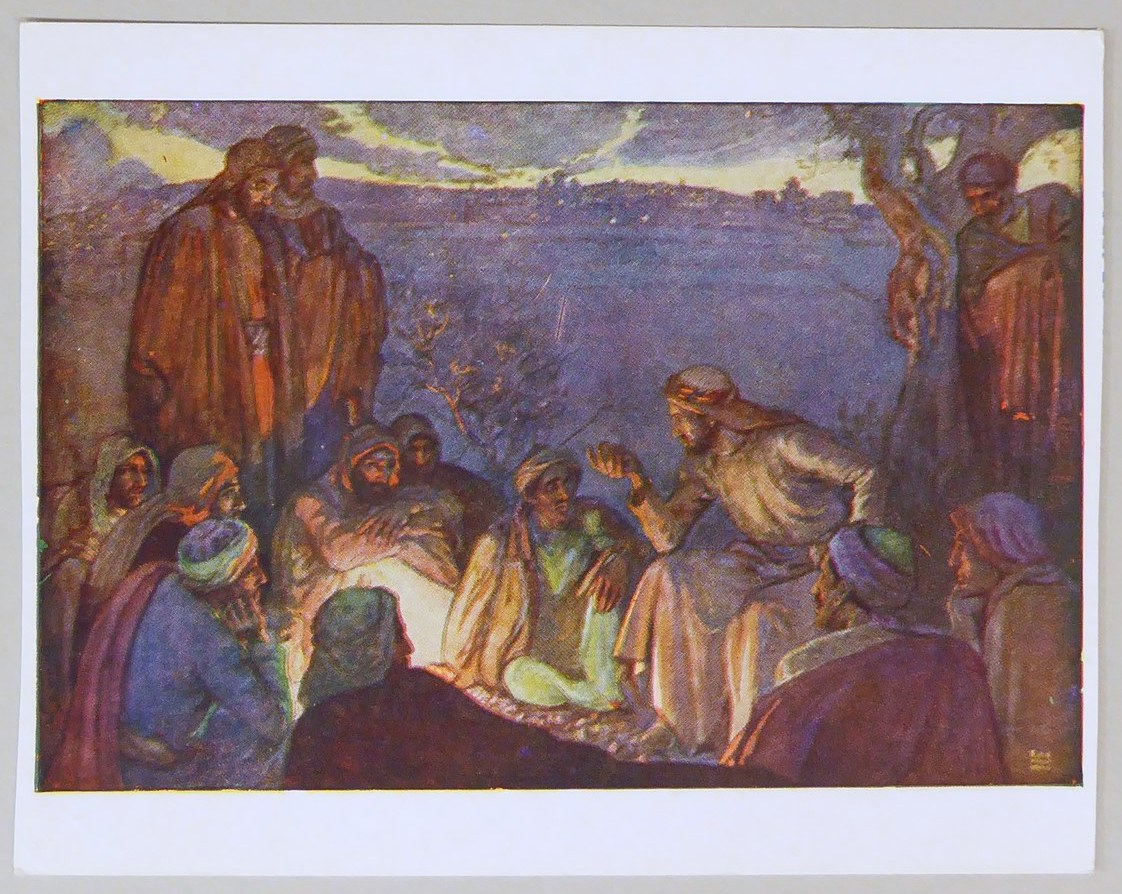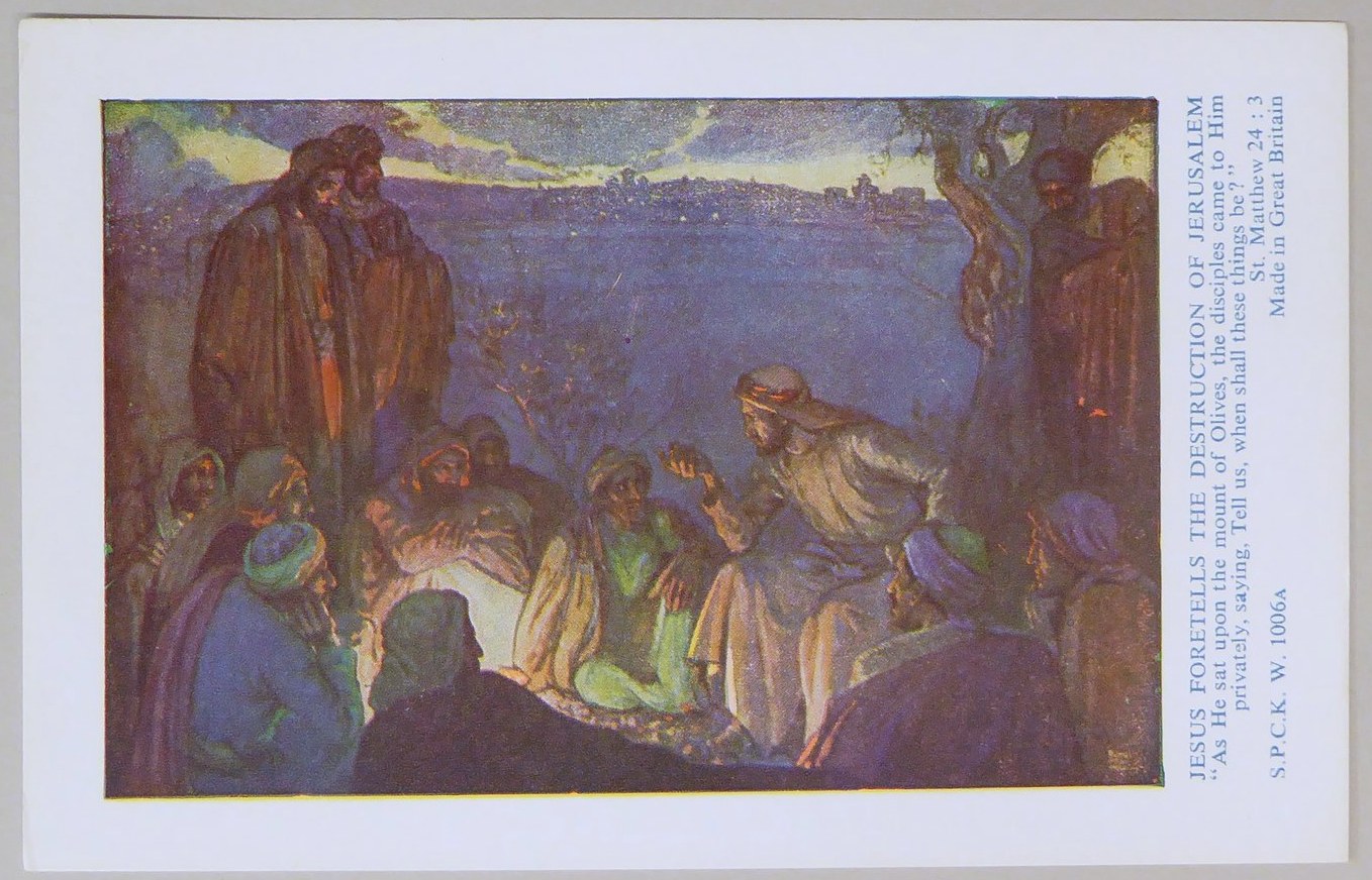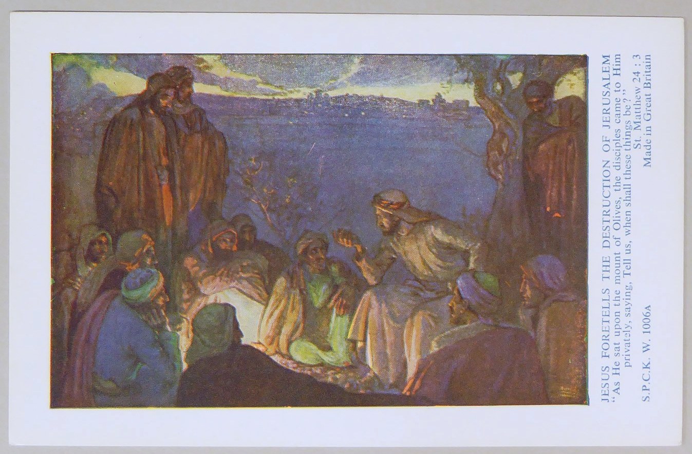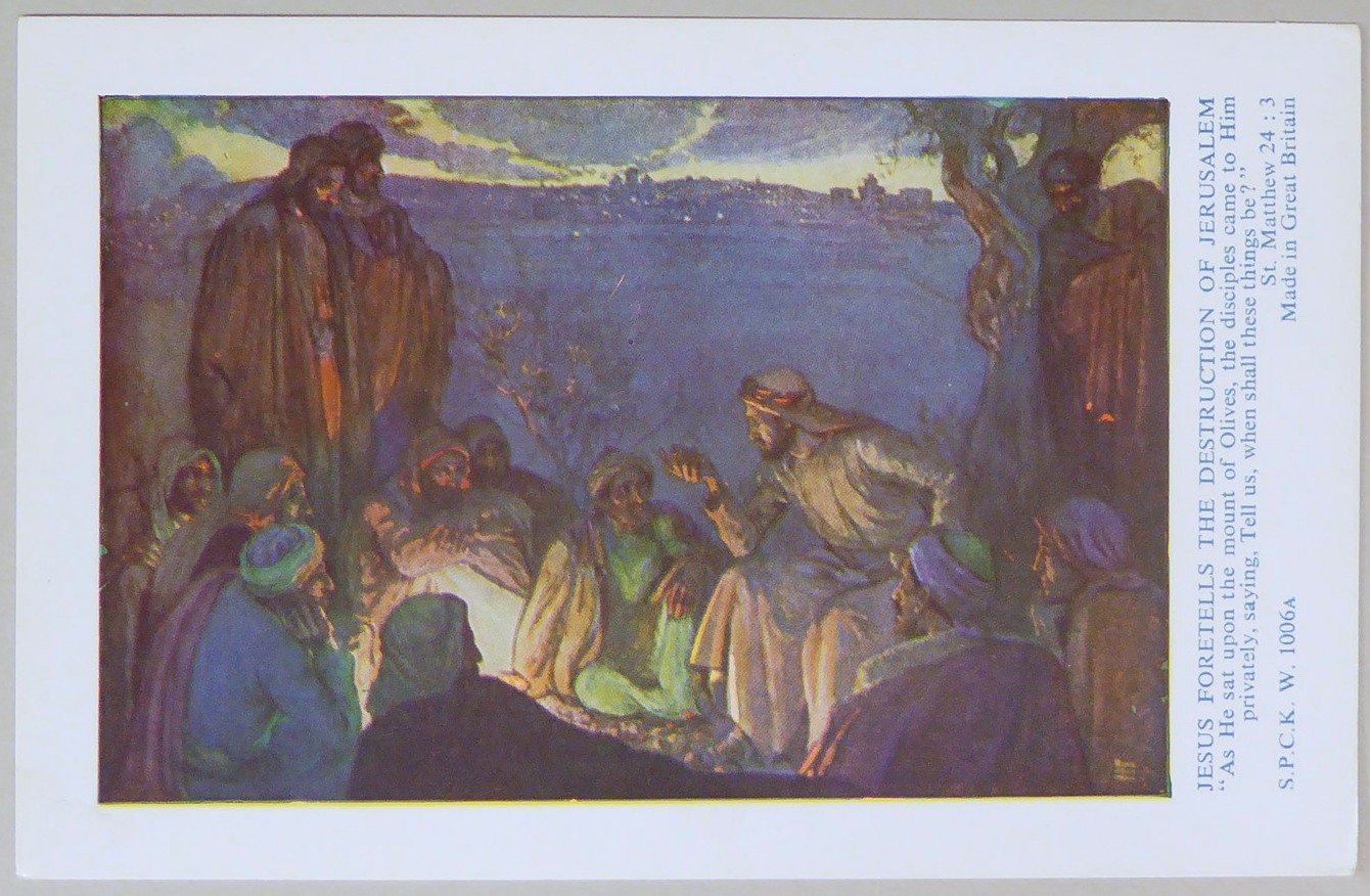 Beloningsplaatje (15 stuks) met Jezus en de discipelen, met "Jezus voorspelt de verwoesting .."
