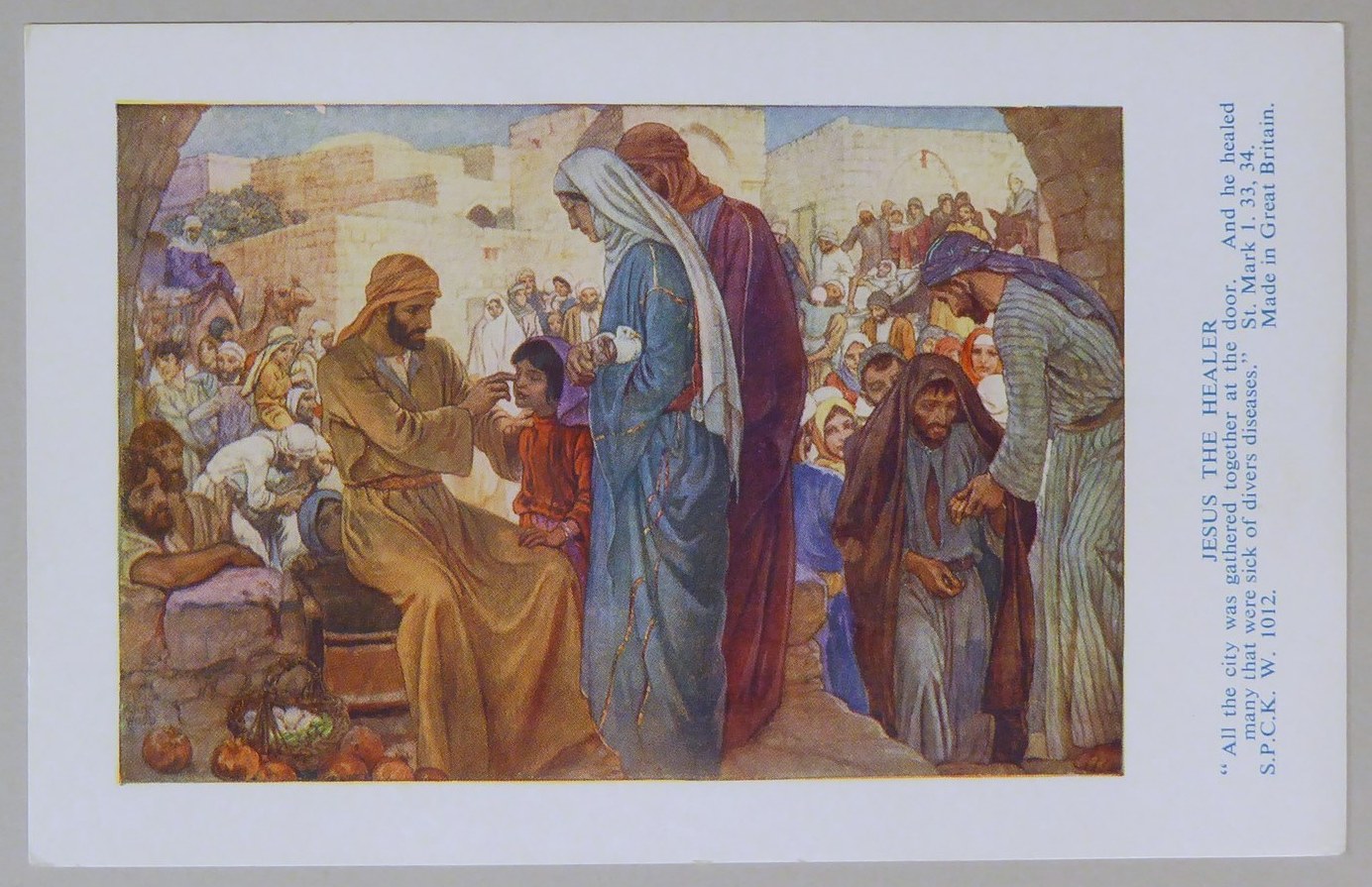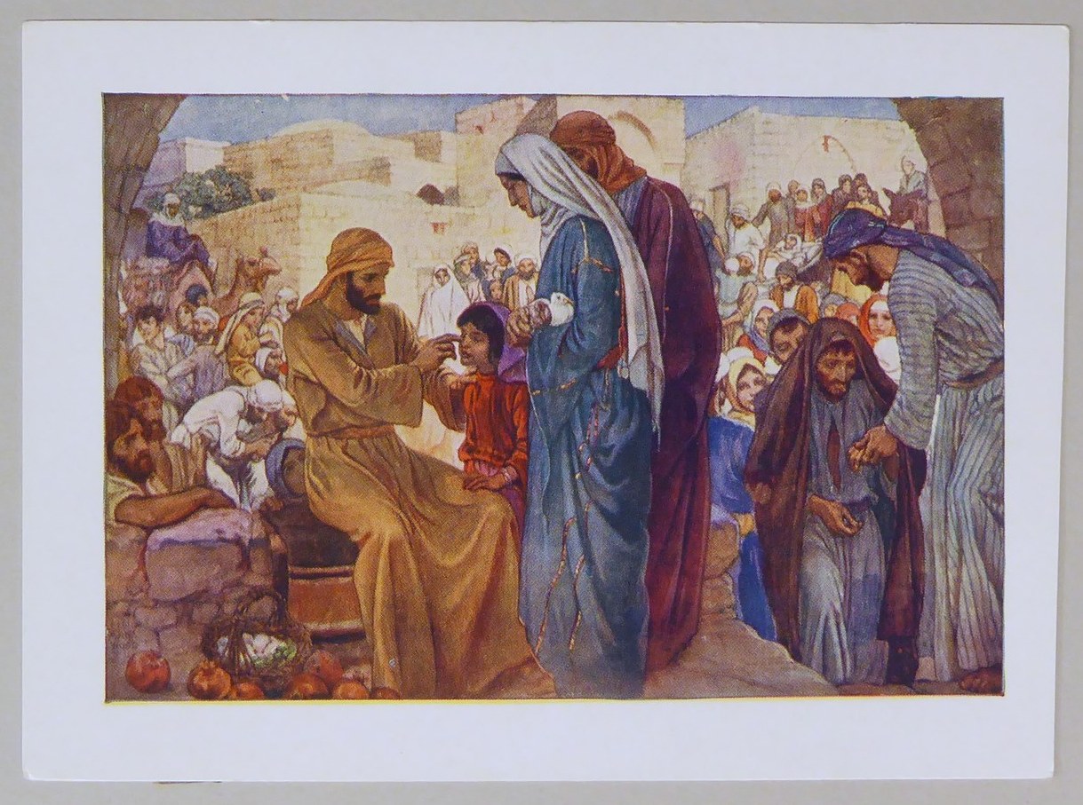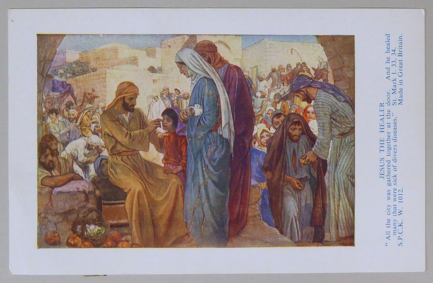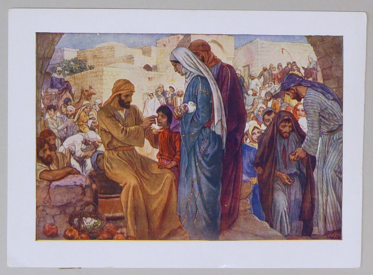 Beloningsplaatje (2 stuks) met Jezus en een klein meisje, met "Jezus als geneesheer"