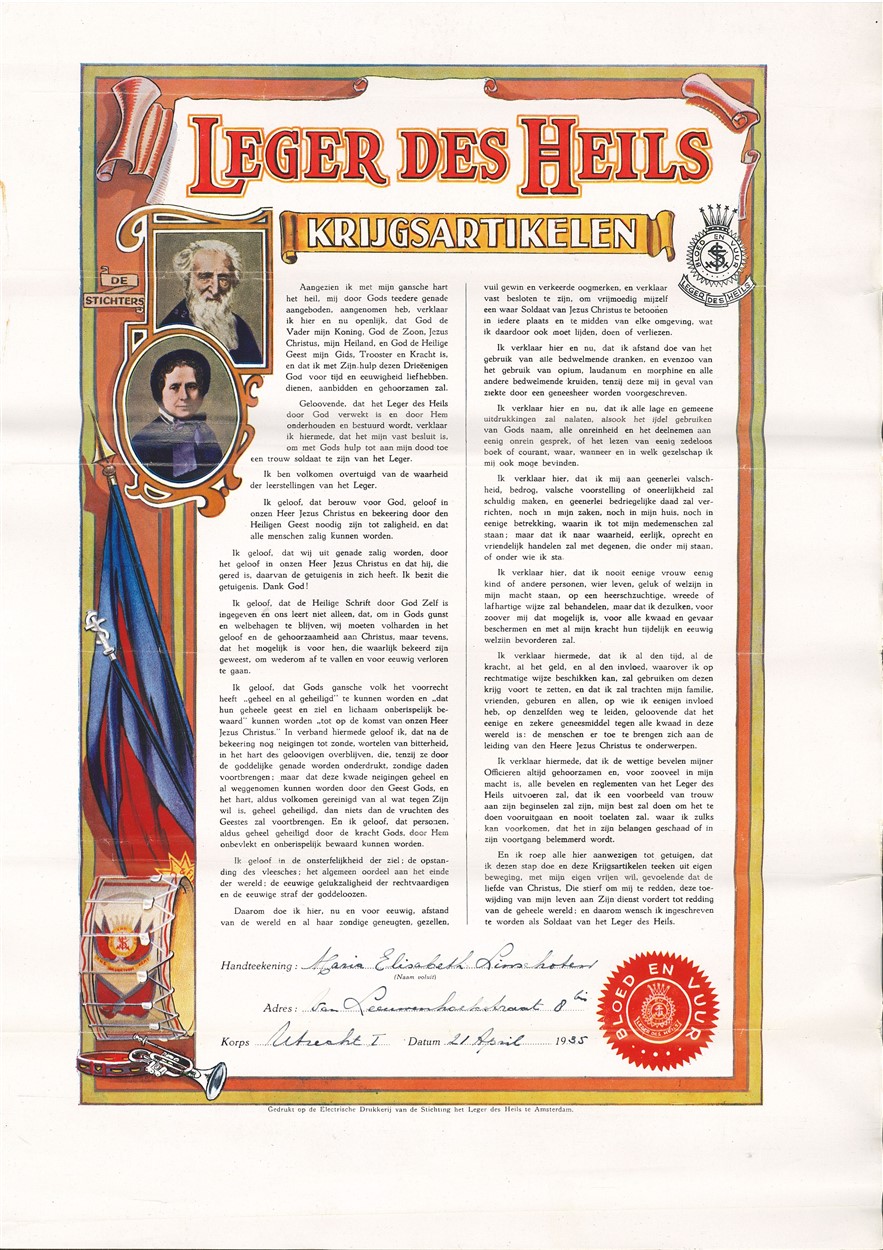 Leger des Heils, krijgsartikelen, bij intrede Maria Elisabeth Linschoten