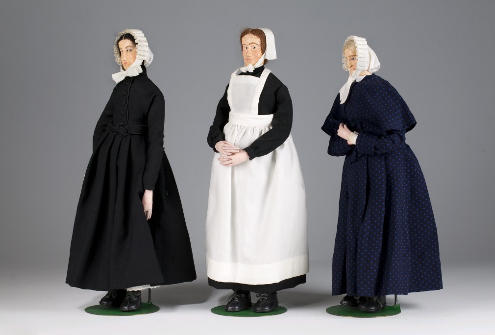 Pop in kostuum van diacones, vermoedelijk zondagse japon met schort (1930-1955)