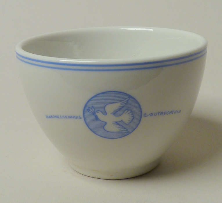 Theekopje met vredesduifembleem en met "Diakonessenhuis Utrecht"