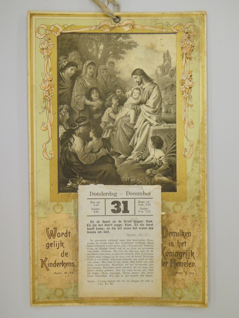 Ondergrond van scheurkalender, met Jezus temidden van kinderschare, met "Wordt gelijk de kinderkens"