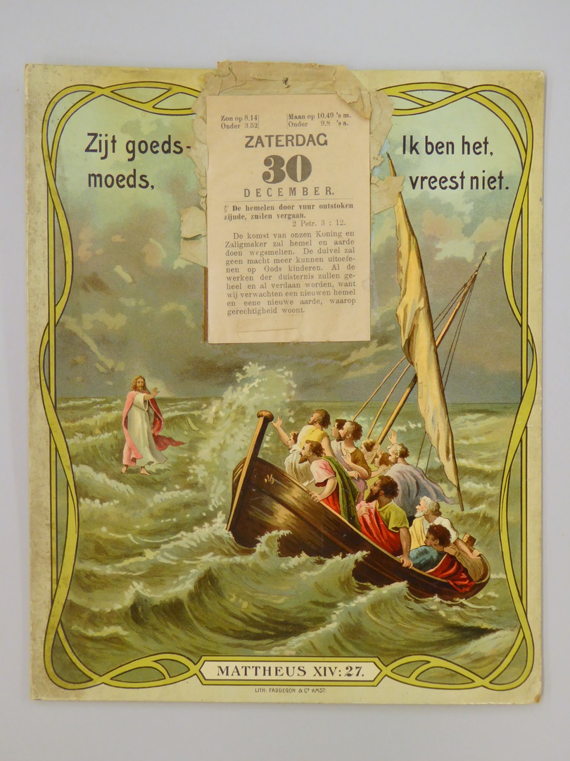 Ondergrond van scheurkalender, Jezus die op het water loopt, met "Ik ben het, vreest niet ..."