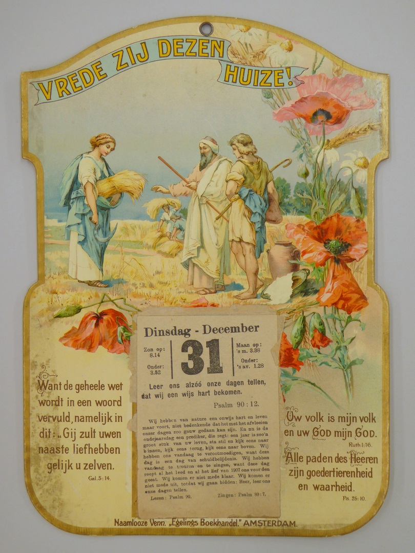 Ondergrond van scheurkalender, Ruth en Boaz op het korenveld, met "Uw volk is mijn volk ..."