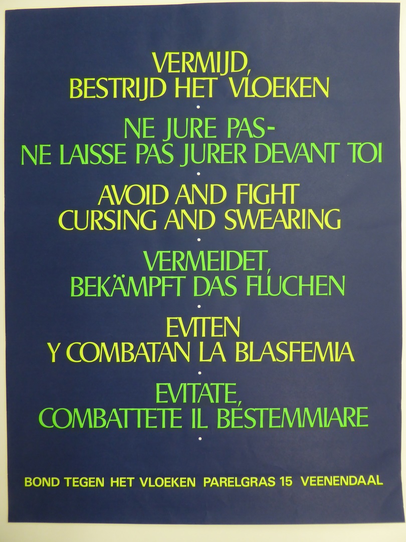 Affiche "Vermijd, bestrijd 't vloeken" in vijf talen in groene en gele letters