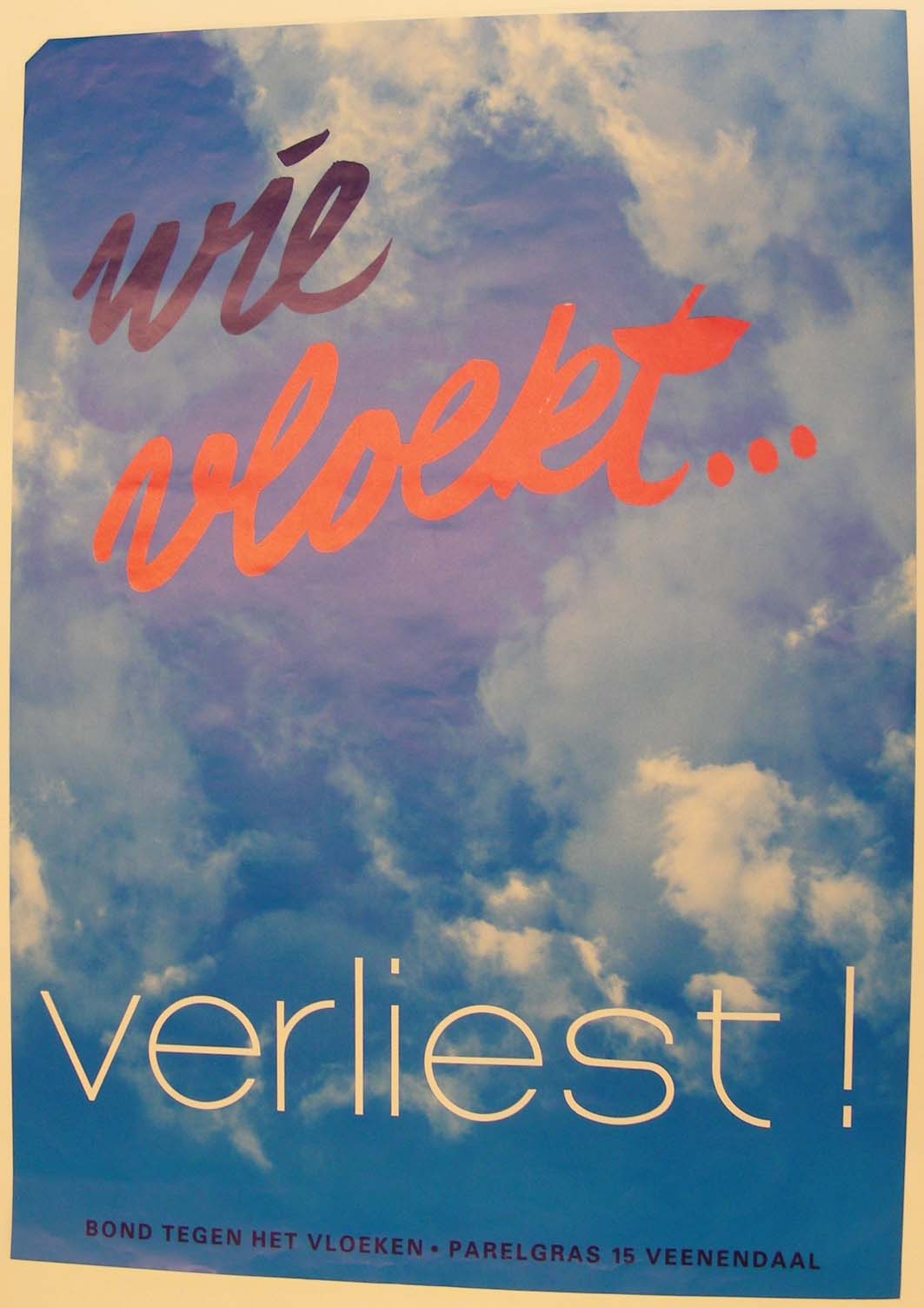 Affiche "Wie vloekt...verliest", in donkerblauwe, rode en witte letters