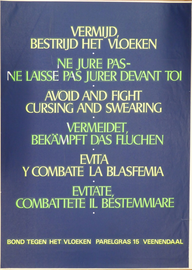 Affiche "Vermijd, bestrijd 't vloeken", in vijf talen in groene en gele letters