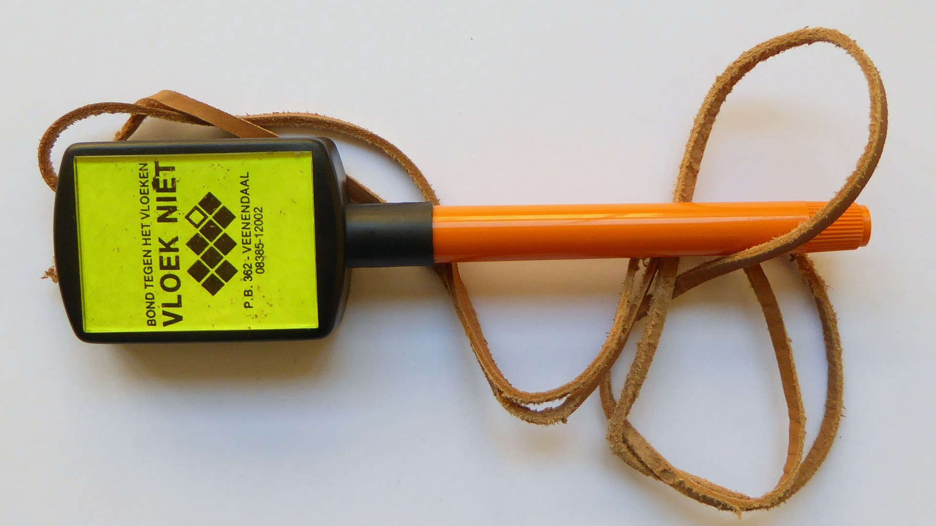 Oranje pen met rechthoekige dop met leren koord waarop "... Vloek niet ..."