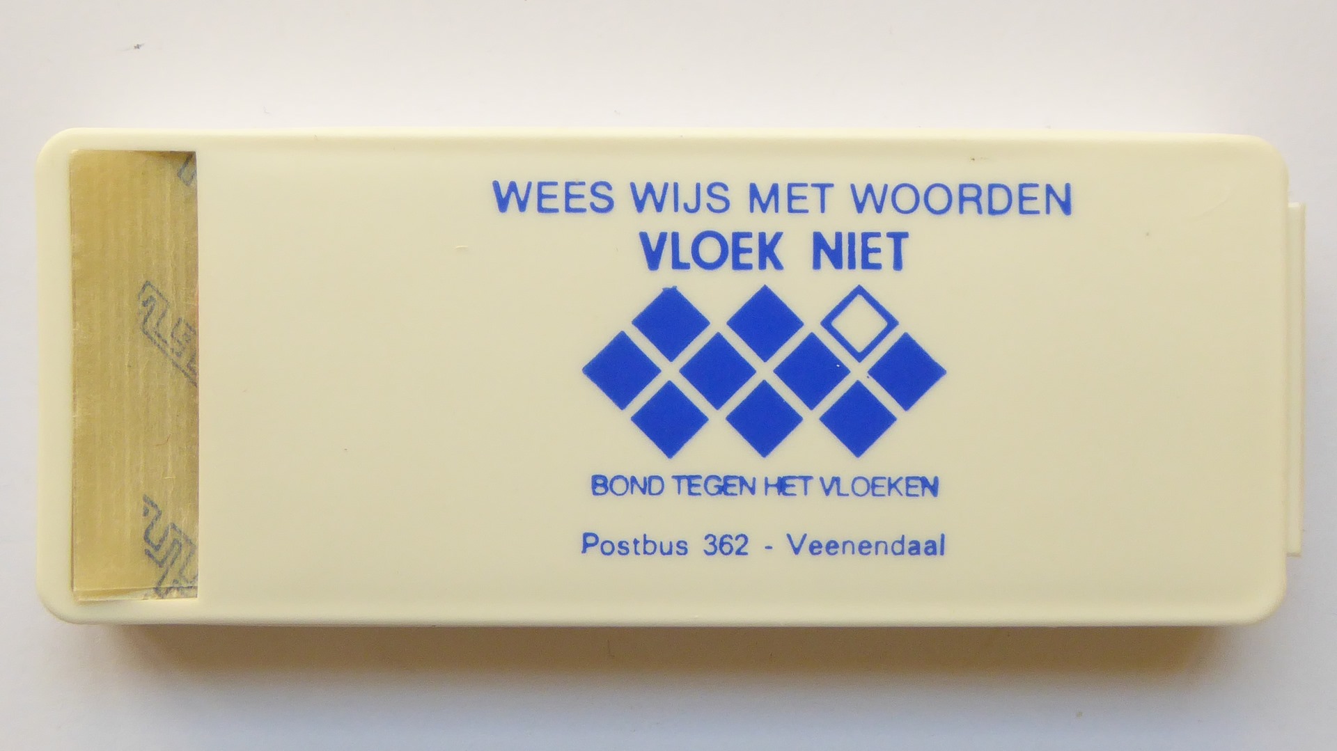 Wit plat doosje met vijf pleisters, met in blauw "Wees wijs met woorden Vloek niet..."