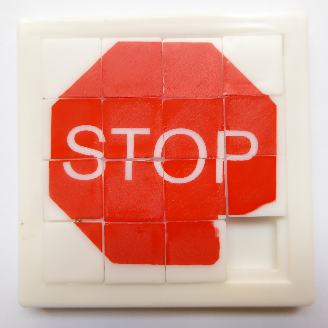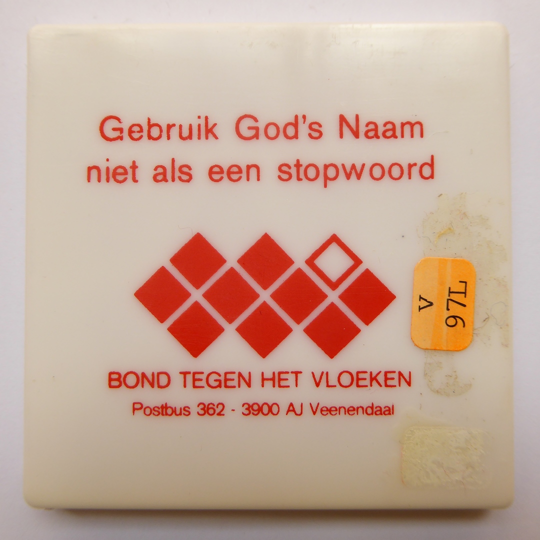 Wit met rode schuifpuzzel met verkeersbord "Stop", achterop "Gebruik God's naam niet als..."
