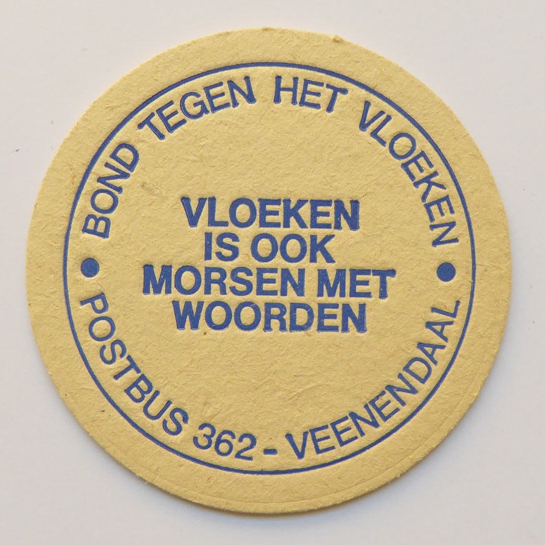 Bierviltje met in blauw "Vloeken is ook morsen met woorden..."