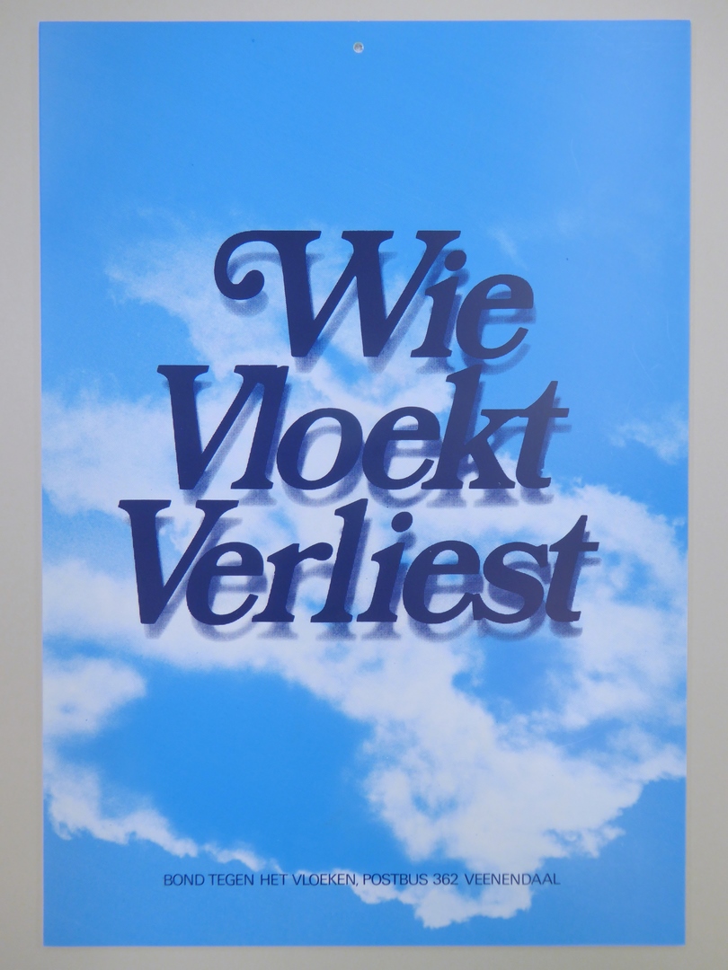 Blauw bord met in donkerblauw "Wie vloekt verliest" tegen wolkenachtergrond