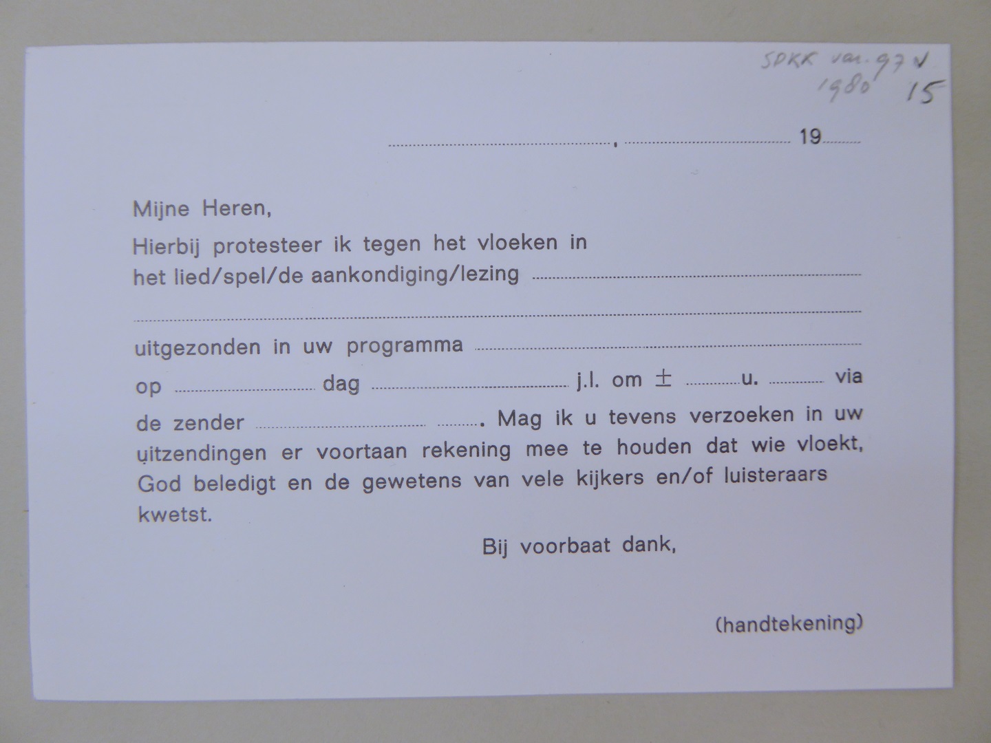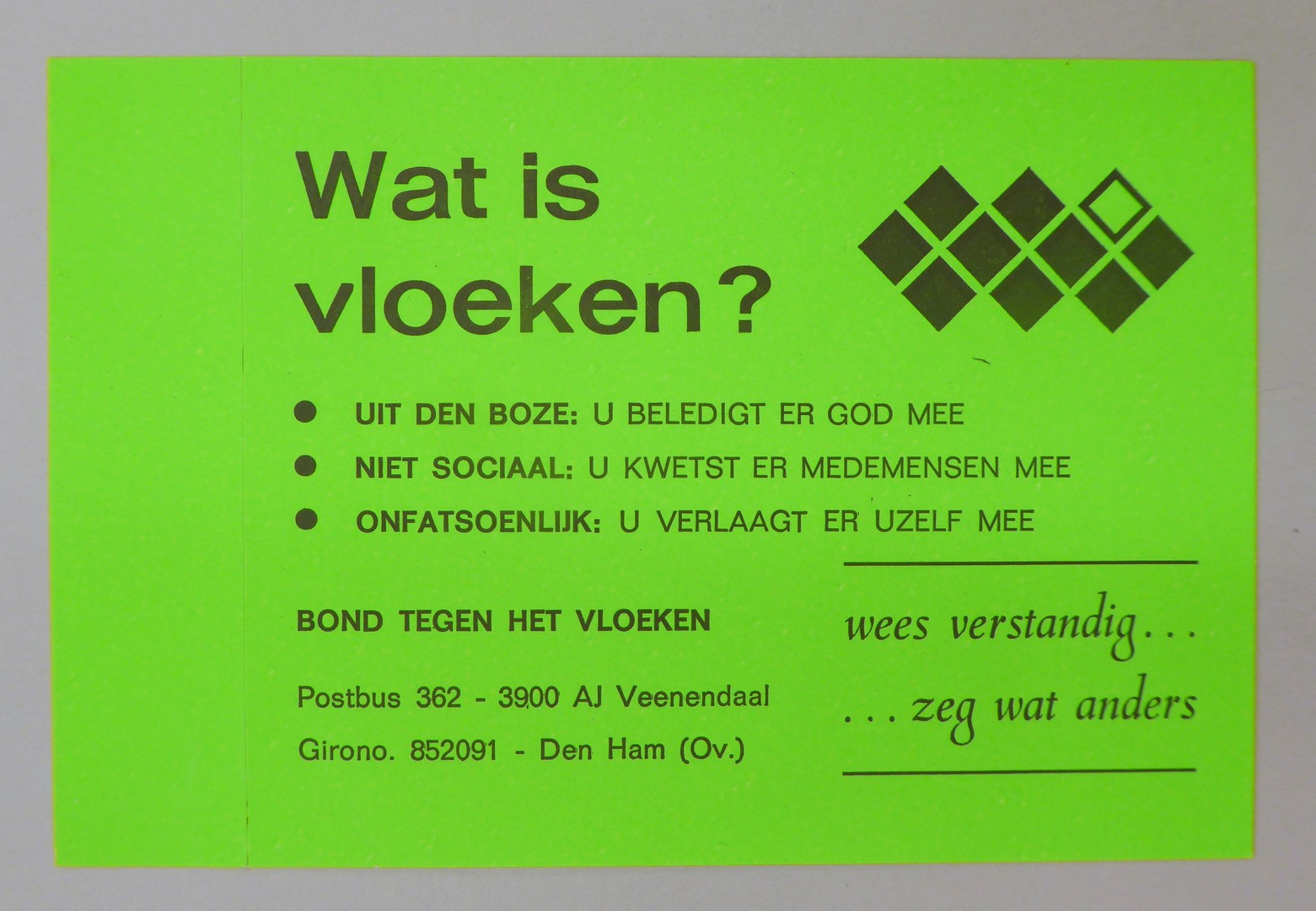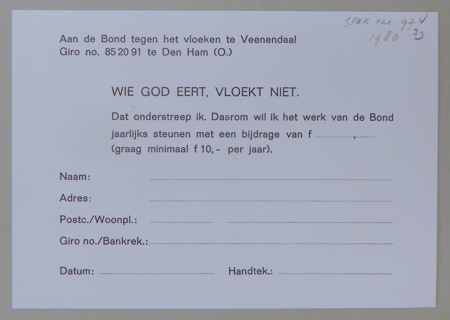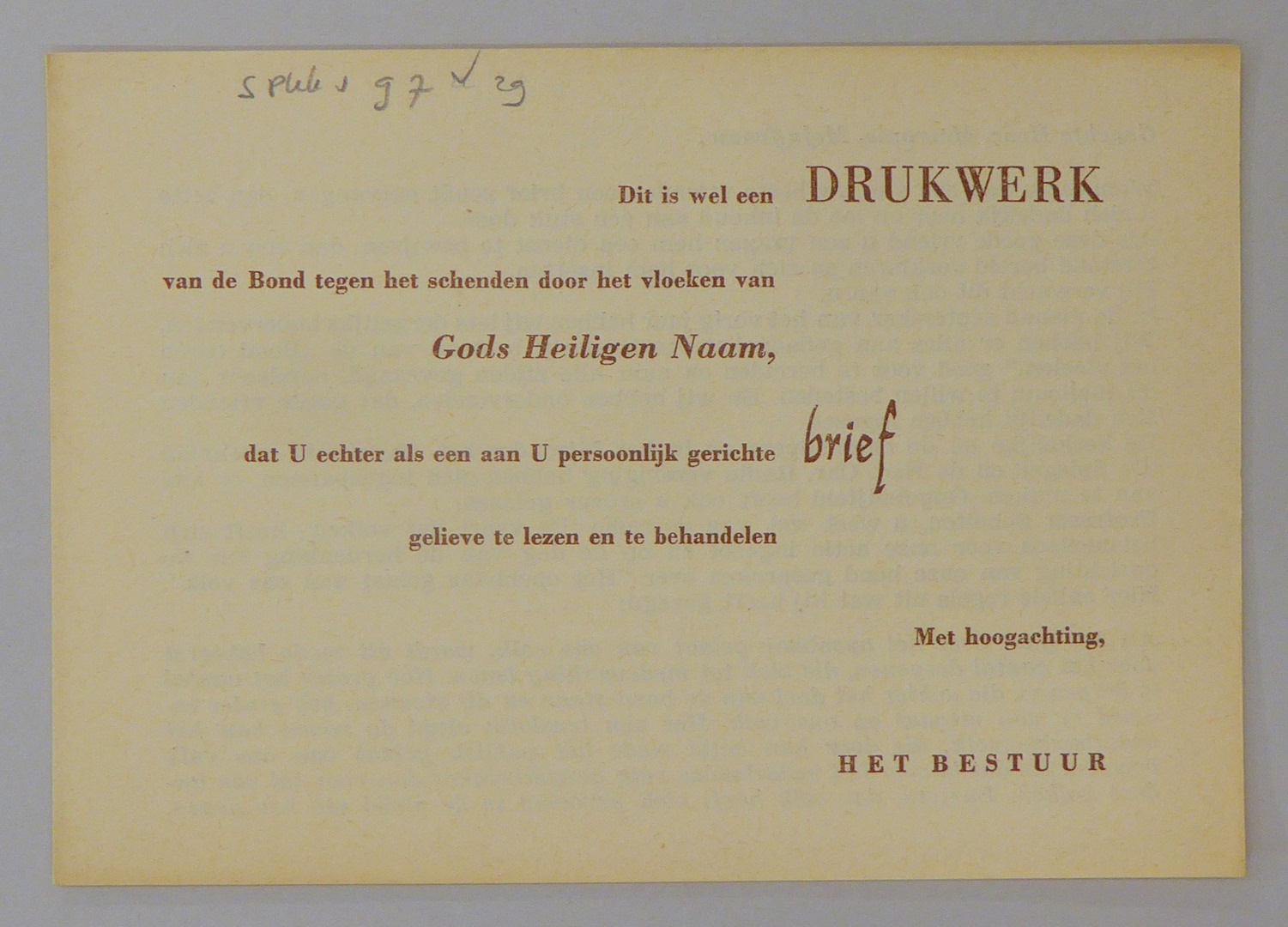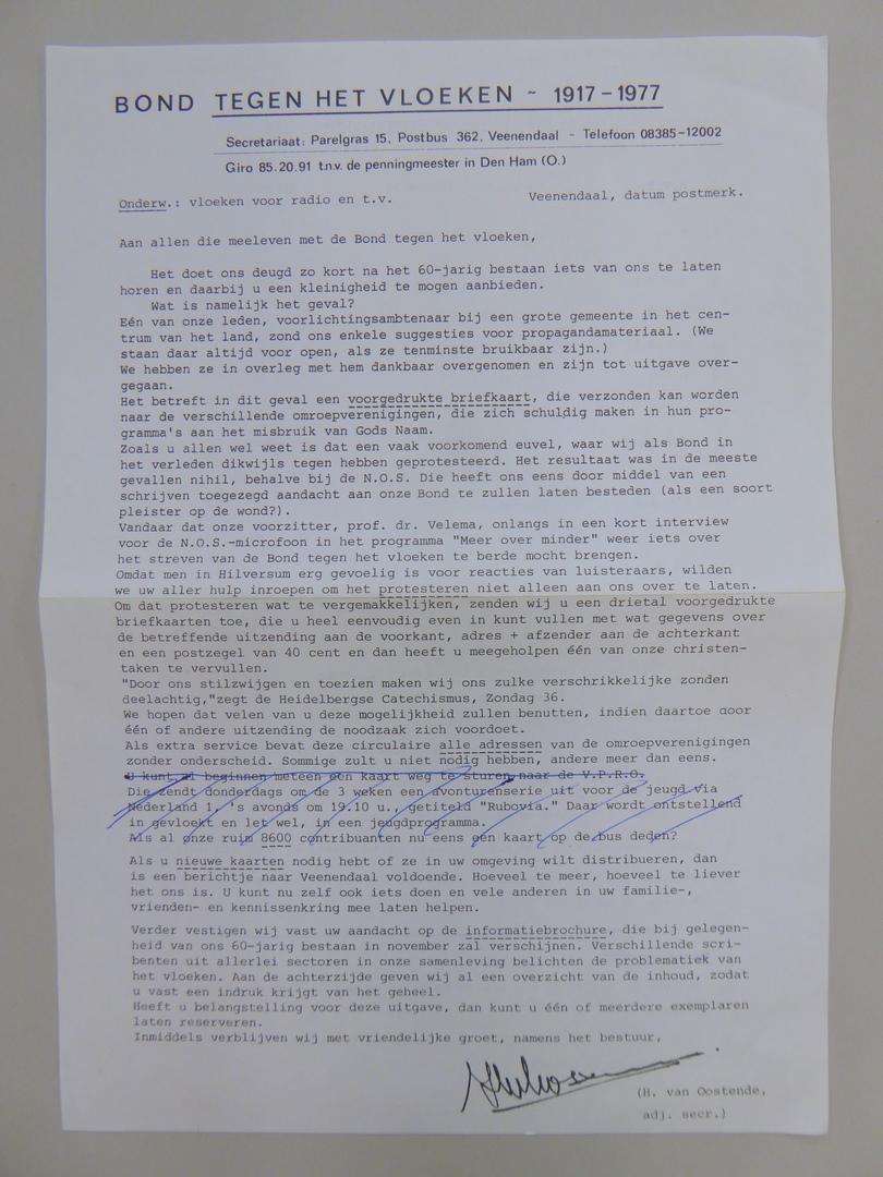 Stickers en kaartjes (genummerd SPKK v97v4 t/m v47) van de Bond tegen het Vloeken