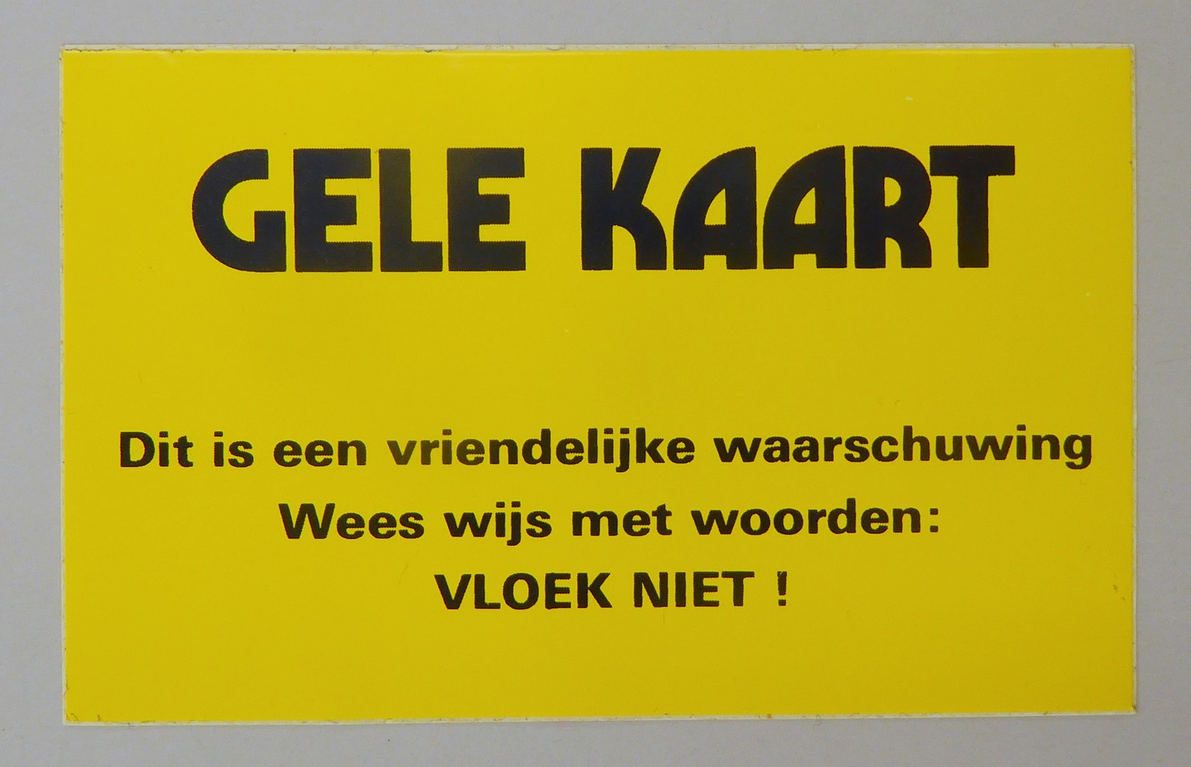 Geel-zwarte sticker met "Gele kaart Dit is een vriendelijke waarschuwing Wees wijs met woorden: Vloek niet!"