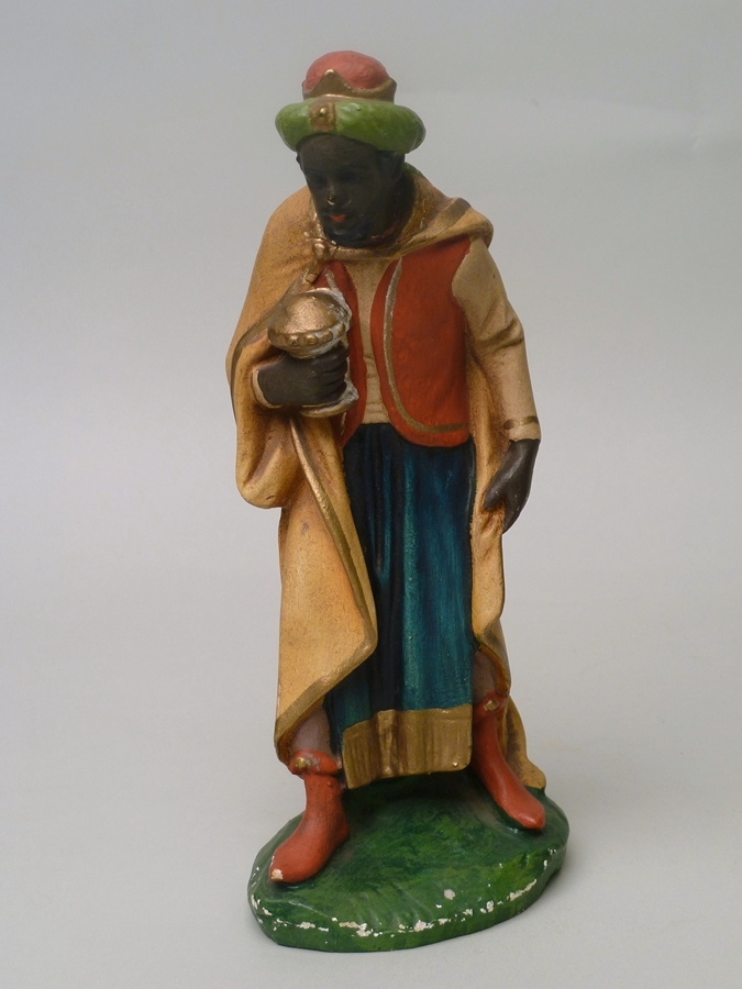 Caspar, zwarte koning, met geschenk in rechterhand