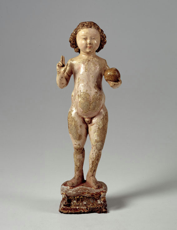 Het naakte Christuskind staat met iets gebogen linkerbeen op een kussentje dat op een sokkel ligt. Hij houdt zijn rechterhand zegenend opgeheven. In zijn linkerhand draagt hij de wereldbol. Zijn bolle gezichtje, met kleine ogen en mond, is omgeven door een krans ronde lokken. Zijn lichaam heeft forse heupen en dijbenen. Het sokkeltje heeft een ...