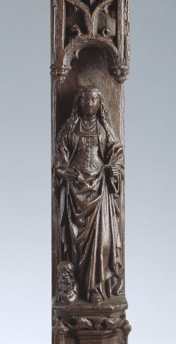 De deurnaald is aan de voorzijde gedecoreerd met de heiligen Johannes de Doper en Catharina, onder laatgotische baldakijnen, boven een hoge, met pinakels gedecoreerde onderzone. Johannes de Doper is aan het bovenuiteinde aangebracht. Hij is frontaal weergegeven, rustend op zijn rechterbeen. Hij heeft zijn gezicht driekwart naar rechts gewend en wijst met zijn rechterhand op ...
