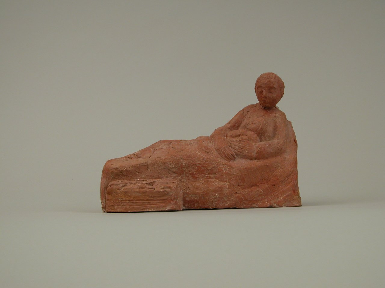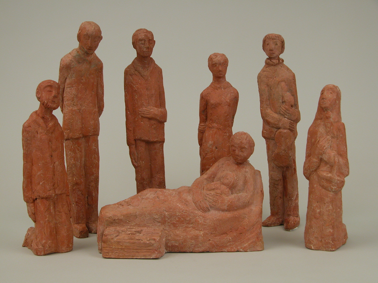 Alle figuren van de kerstgroep zijn geboetseerd in klei. In de onderzijde gaten voor verankering op een pen.