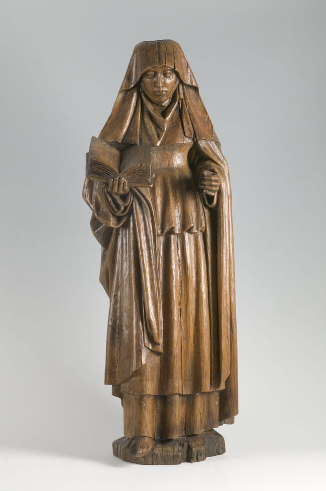 Staande Gertrudis van Nijvel, in rechterhand opengeslagen boek, staf ontbreekt