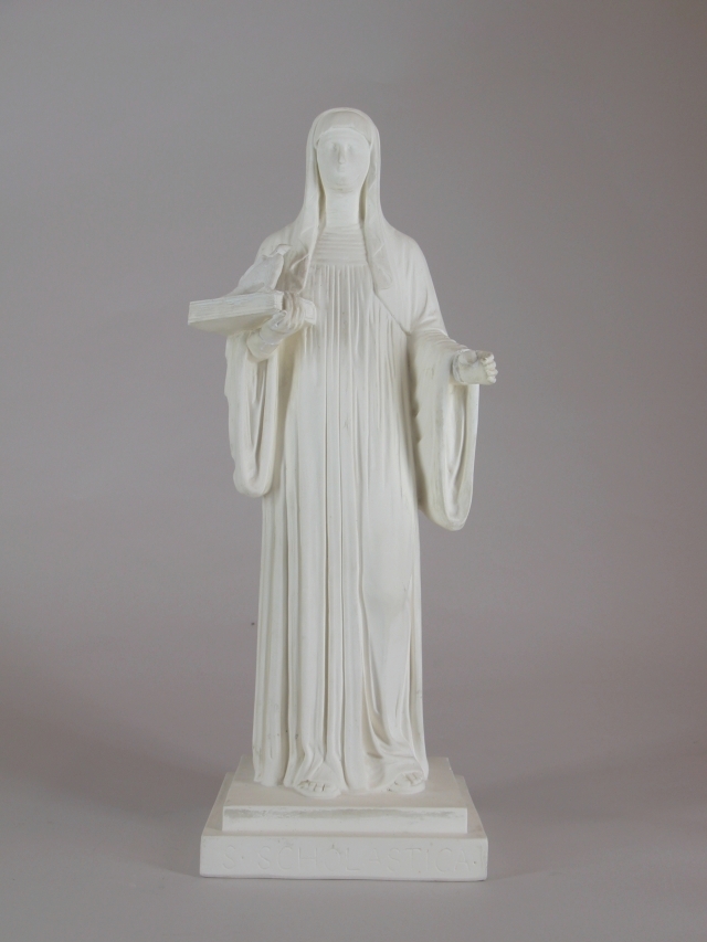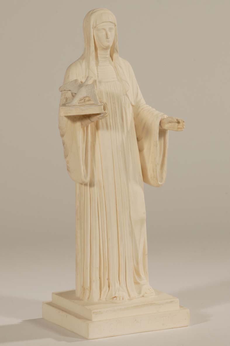 Staande H. Scholastica met boek in rechterhand waarop duif