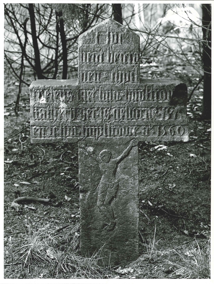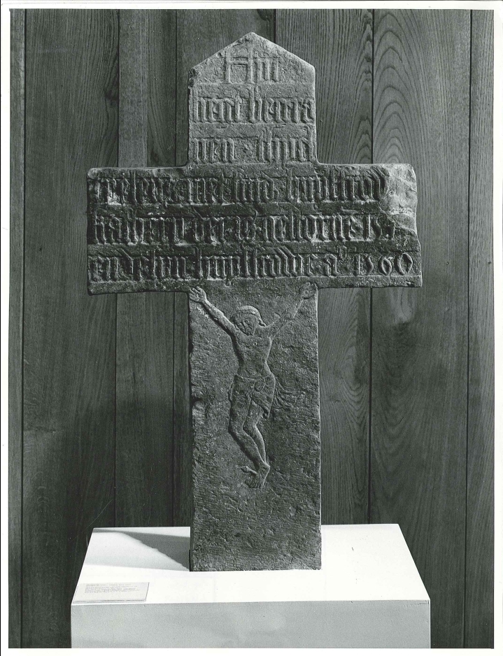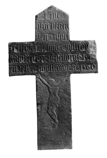 Stenen grafkruis met "Hyr ligt begraven Thyel Tyelens met siner huysfrowe Katheryn ..."