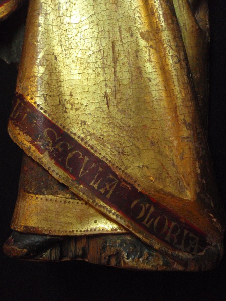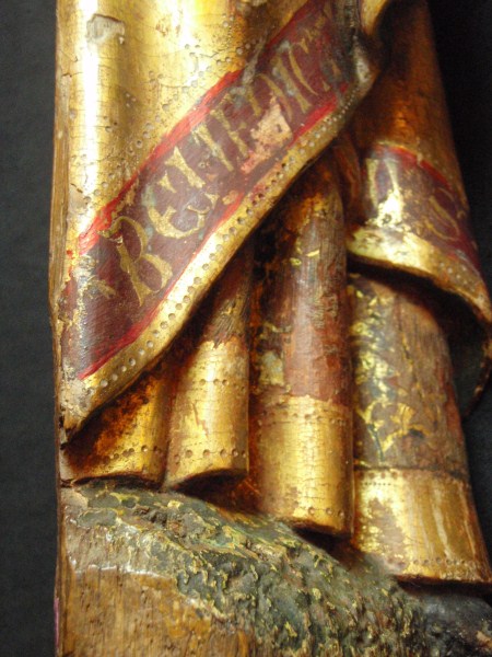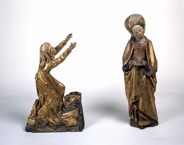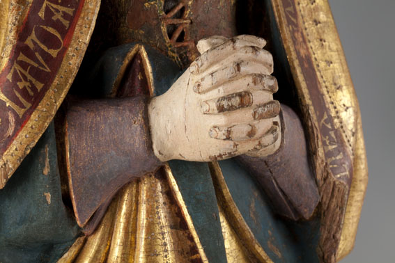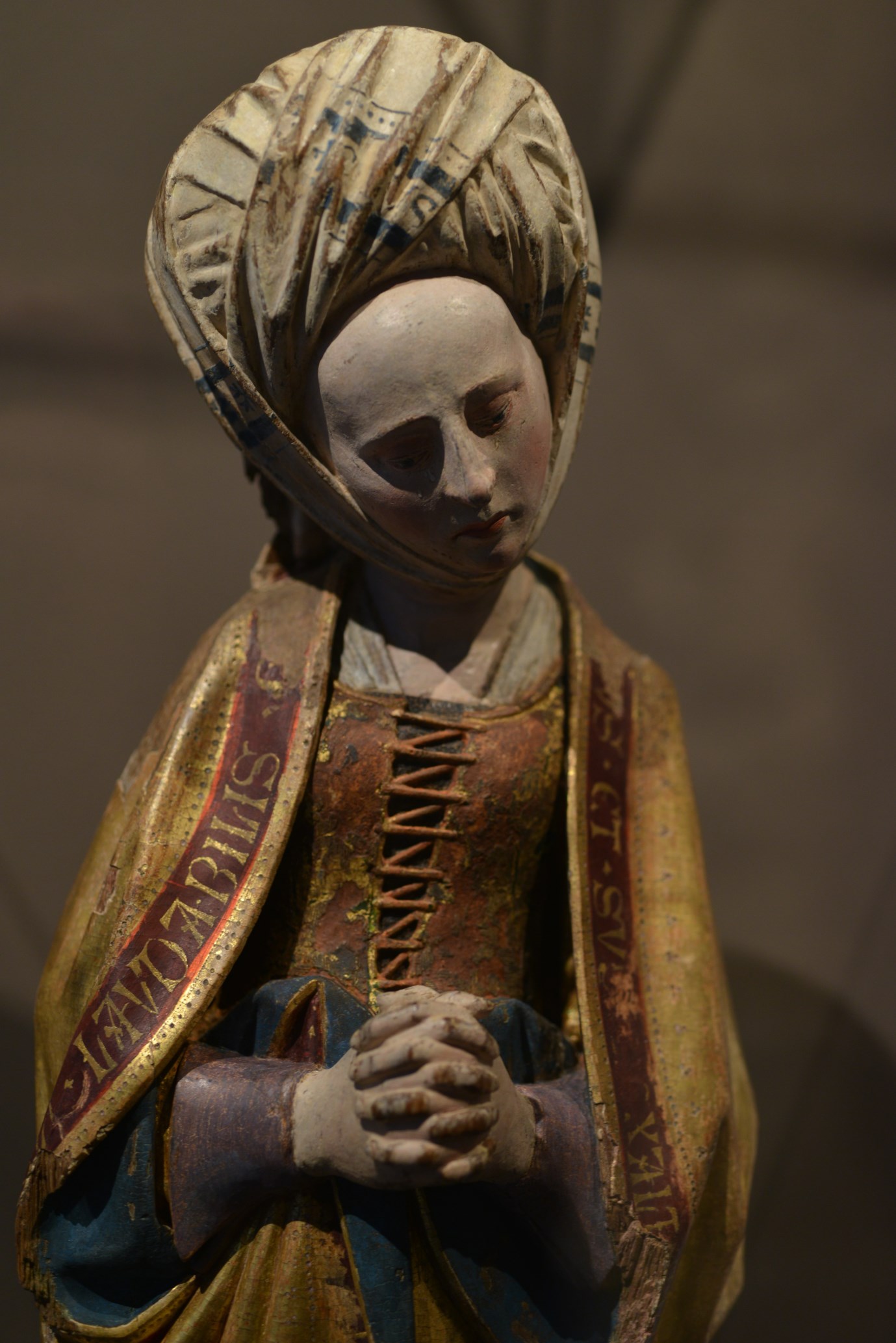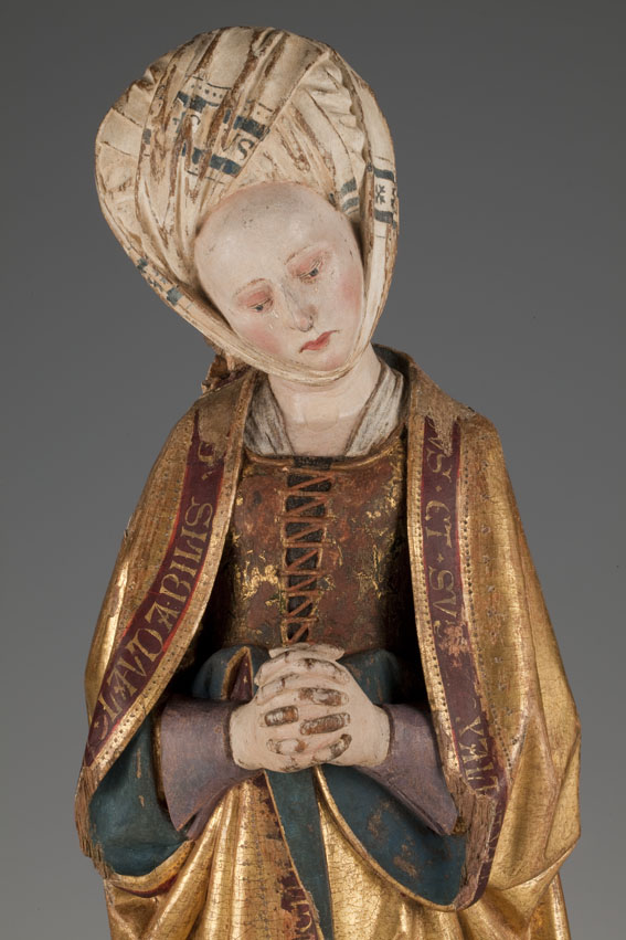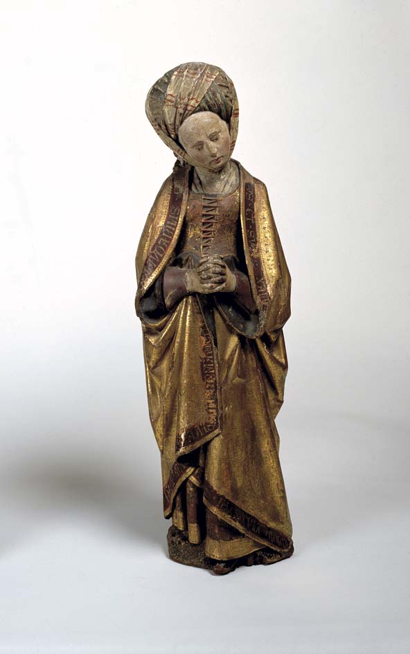 Treurende vrouw uit passievoorstelling, frontaal, in gebedshouding, tulbandvormige hoofdtooi, tekst