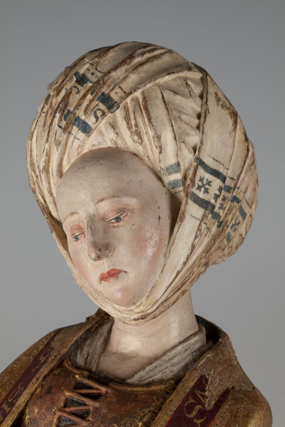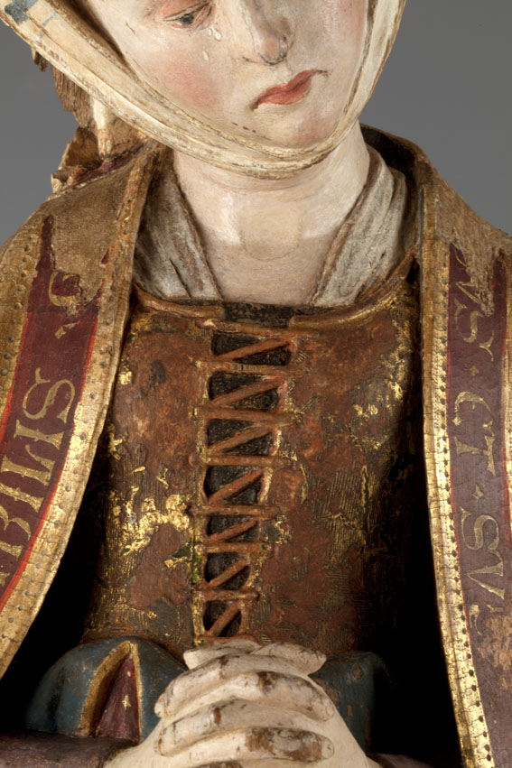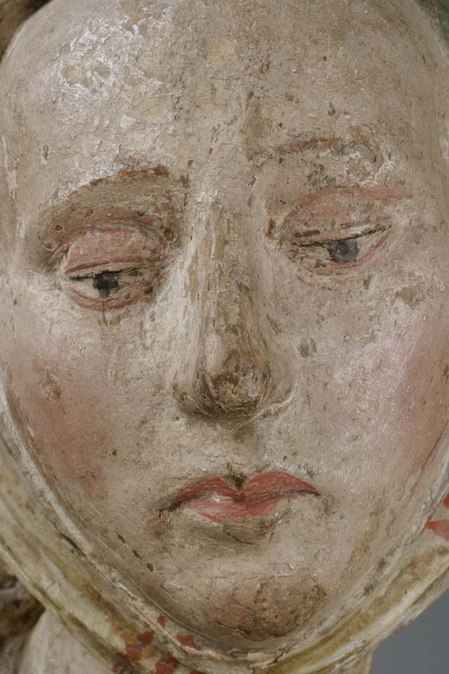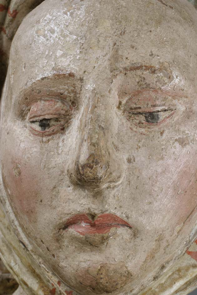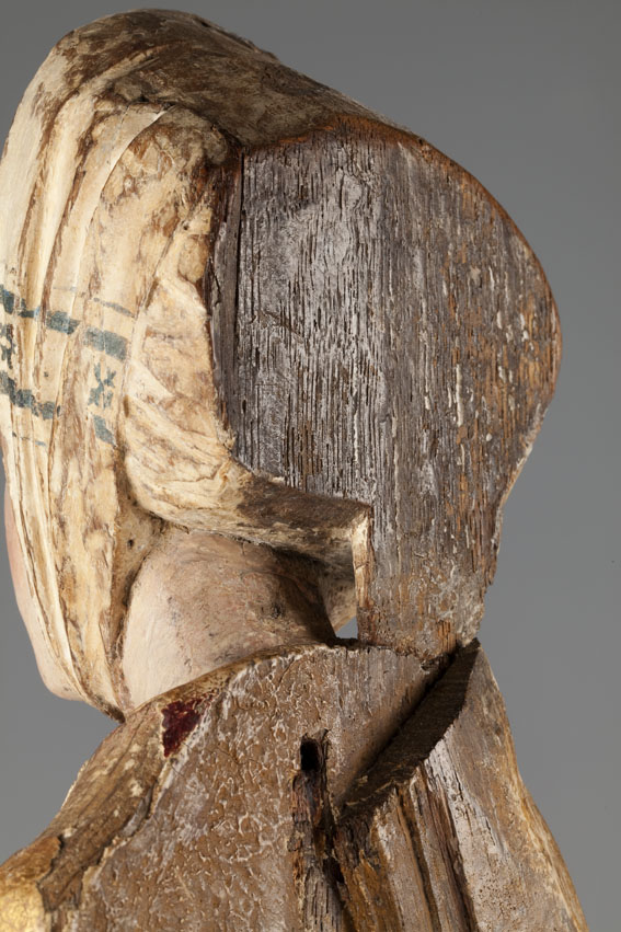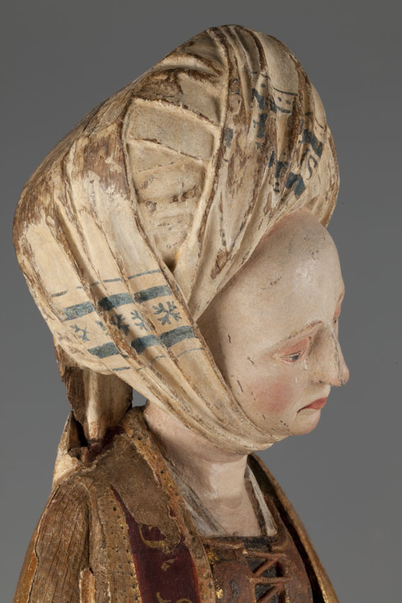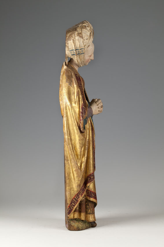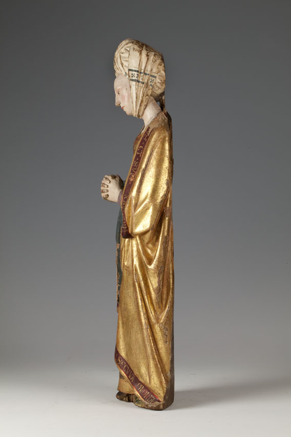 De treurende vrouw is frontaal weergegeven. Haar linkerbeen is iets vooruit geschoven, haar hoofd iets naar links geneigd. Ze houdt haar handen voor de buik gevouwen en kijkt naar beneden. Op het hoofd van de vrouw staat een tulband, die op zijn plaats gehouden wordt door een doek die onder haar kin doorgehaald is. De ...