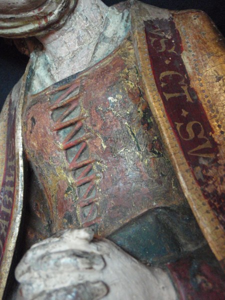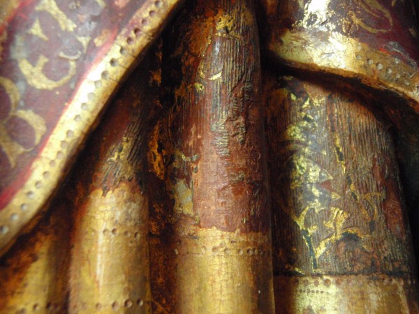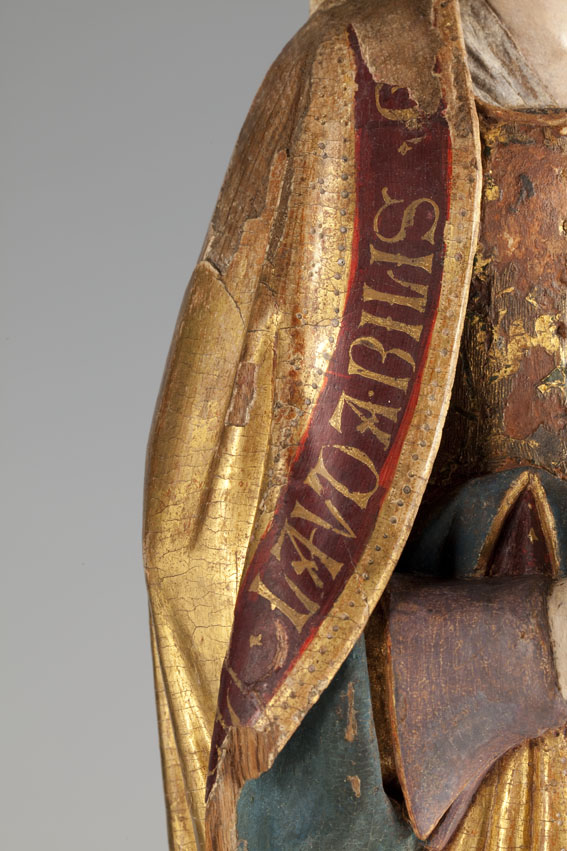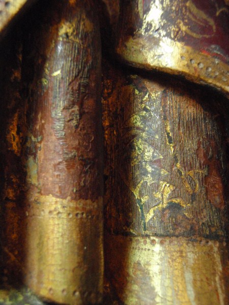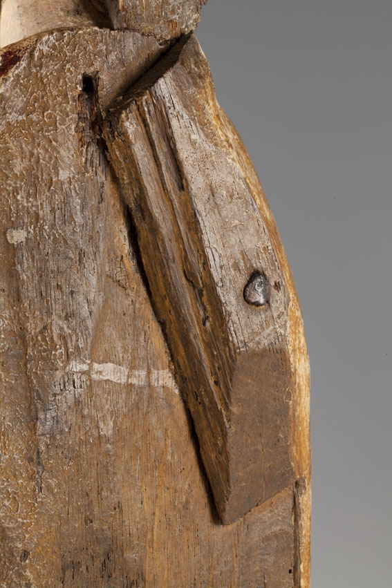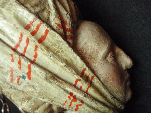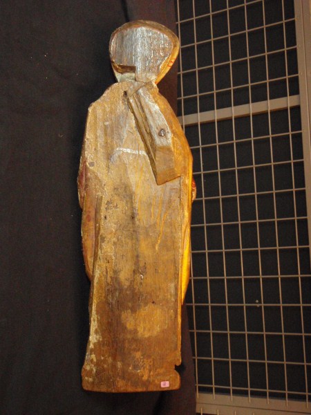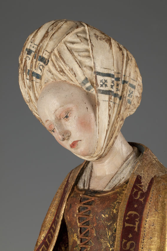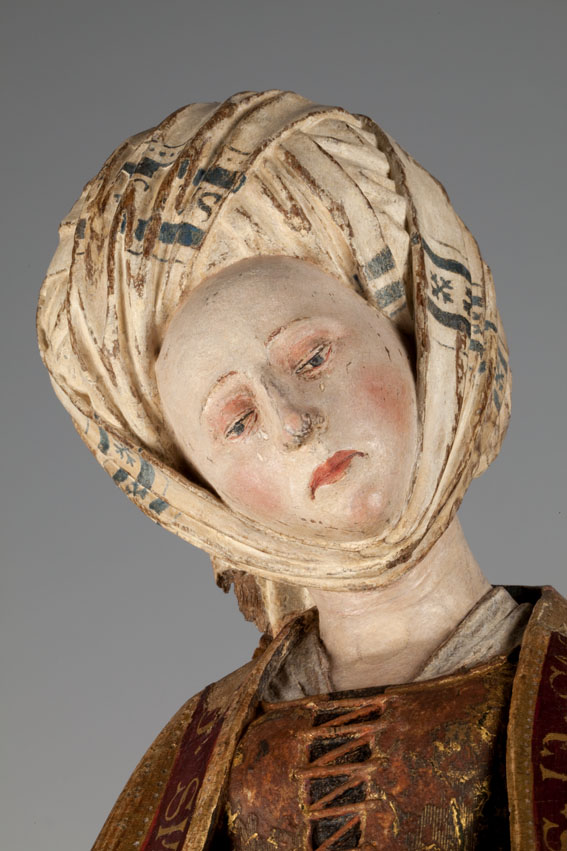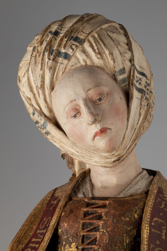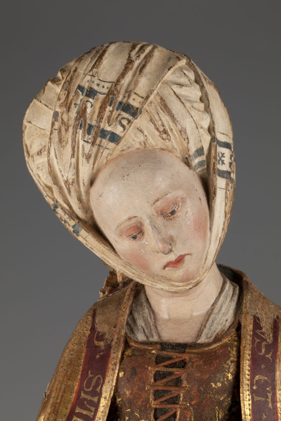 De treurende vrouw is frontaal weergegeven. Haar linkerbeen is iets vooruit geschoven, haar hoofd iets naar links geneigd. Ze houdt haar handen voor de buik gevouwen en kijkt naar beneden. Op het hoofd van de vrouw staat een tulband, die op zijn plaats gehouden wordt door een doek die onder haar kin doorgehaald is. De ...