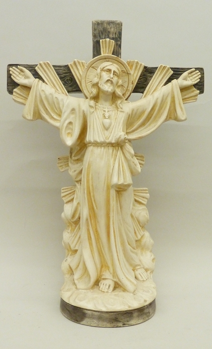 H. Hart Christus in lang gewaad staande voor kruis, ertussen stralenbundels