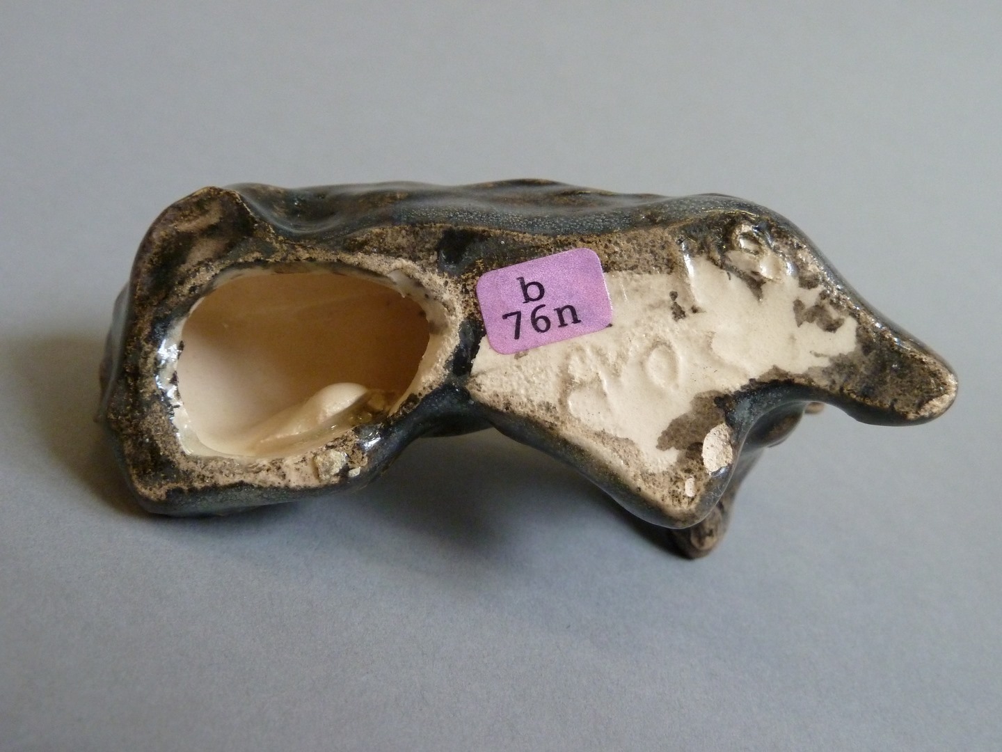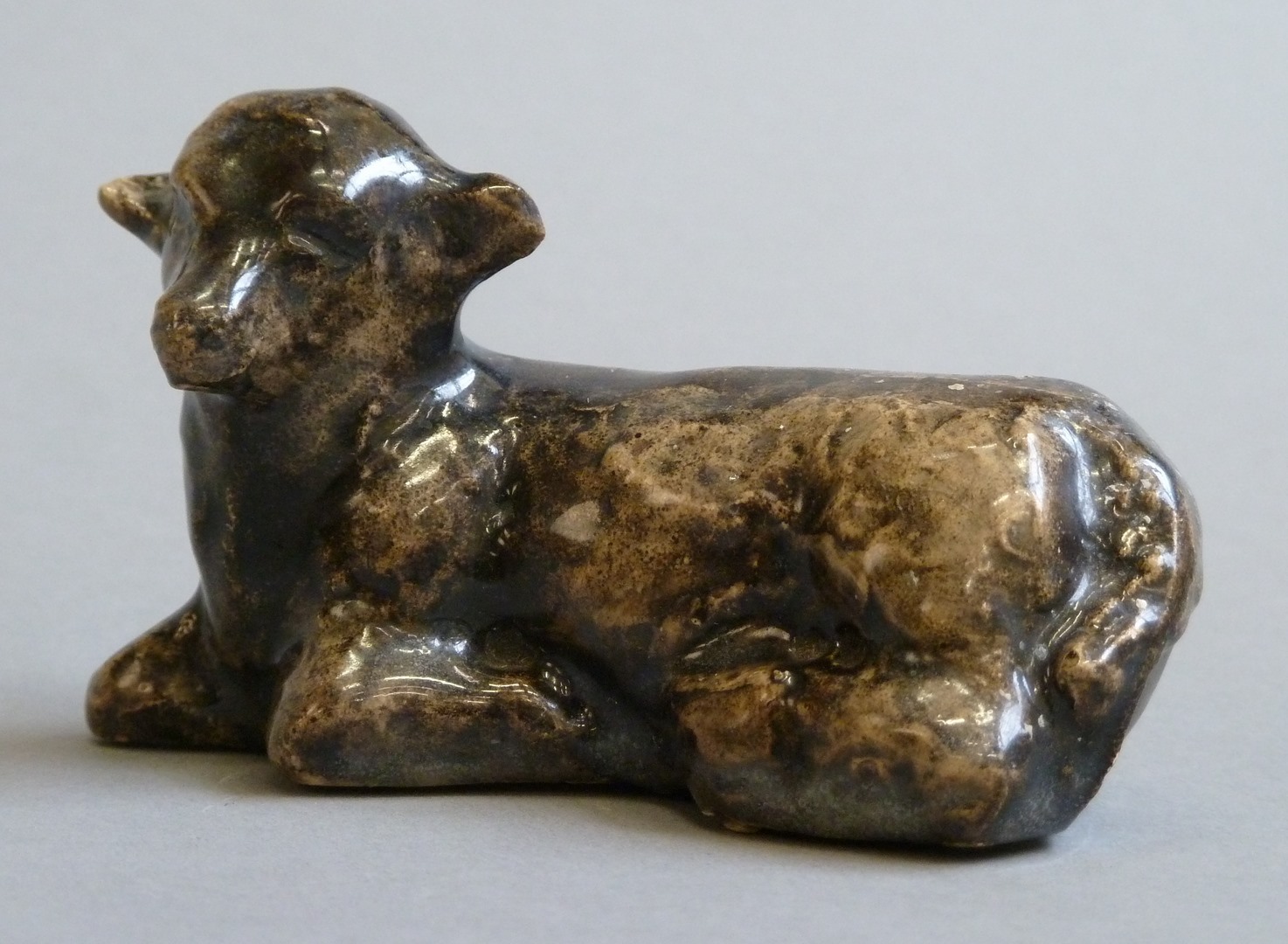 Liggend zwart schaap. Gemerkt 'AVOS'.