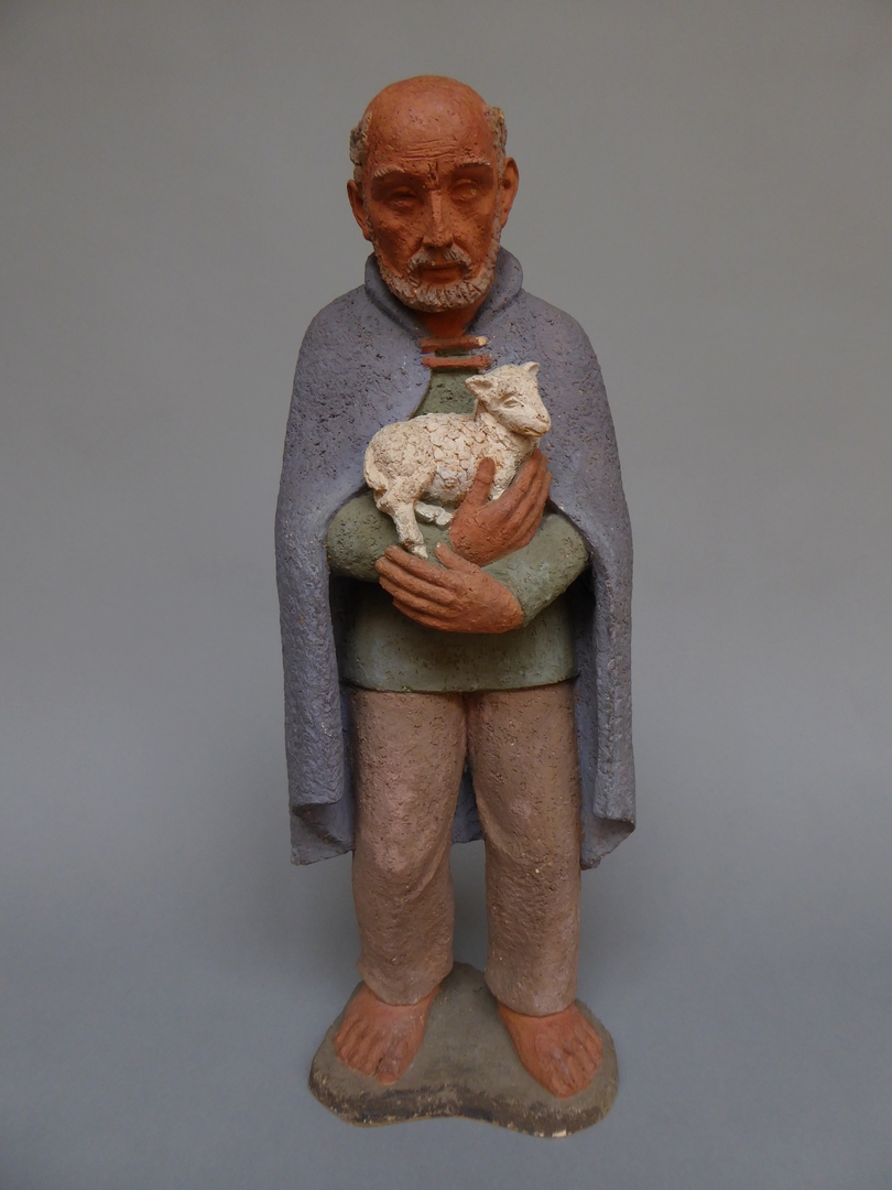 Staande herder met lam in de armen, in groen hemd en blauwe mantel