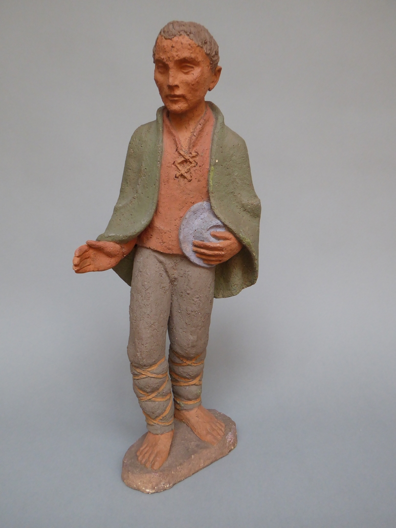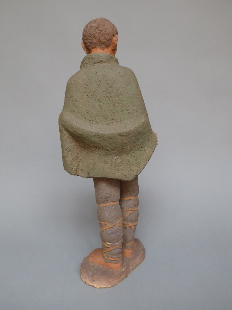 Staande herder met hoed in linkerhand, in bruin hemd en groene mantel