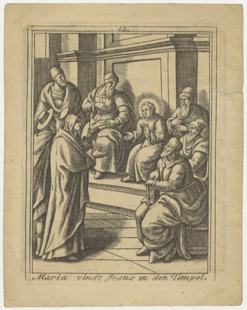 Het leven der Heilige Maagd Maria (serie): 13. Maria vindt Jezus in de tempel, kz. religieus, bid voor ziel Henricus Groenen (+1814), Amsterdam, priester in kerk de Krijtberg