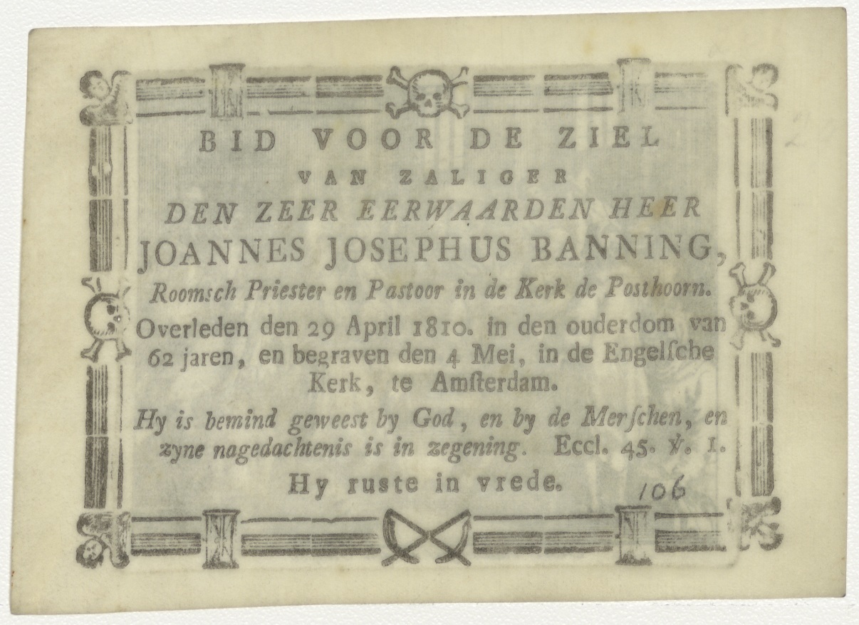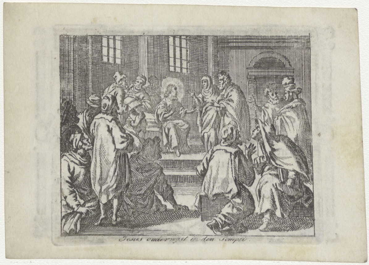 Jezus (Christus) onderwijst in den tempel, kz. Religieus;Bid voor ziel Joannes Josephus Banning (+1810) Amsterdam, pastoor in de kerk De Posthoorn
