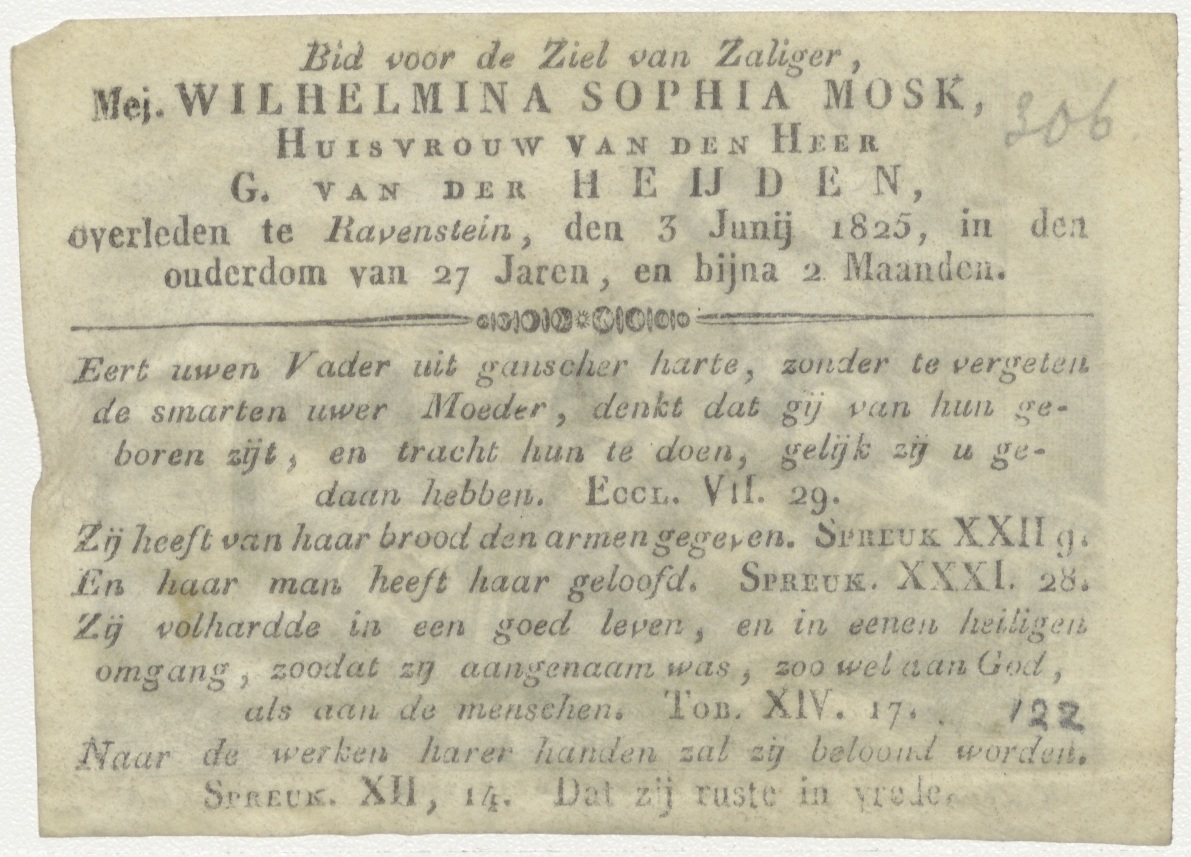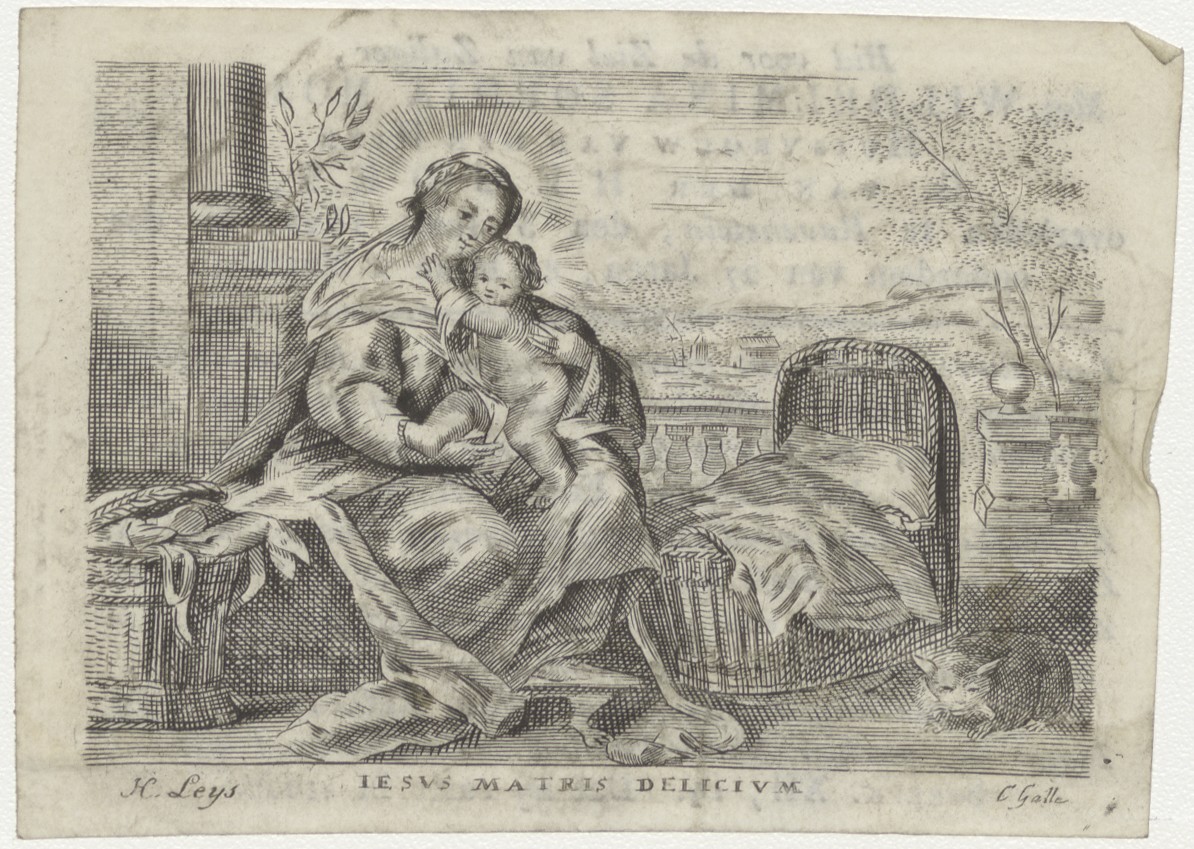 Maria met kind bij wieg met kat, Bid voor ziel Wilhelmina Sophia Mosk (+1825) Ravenstein, huisvrouw van G. van der Heijden