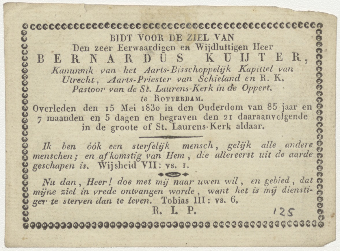 Christuskind het kruis dragend, kz. Religieus;Bid voor ziel Bernardus Kuijter (+1830), pastoor Rotterdam (Oppert);Rotterdam (Laurenskerk)