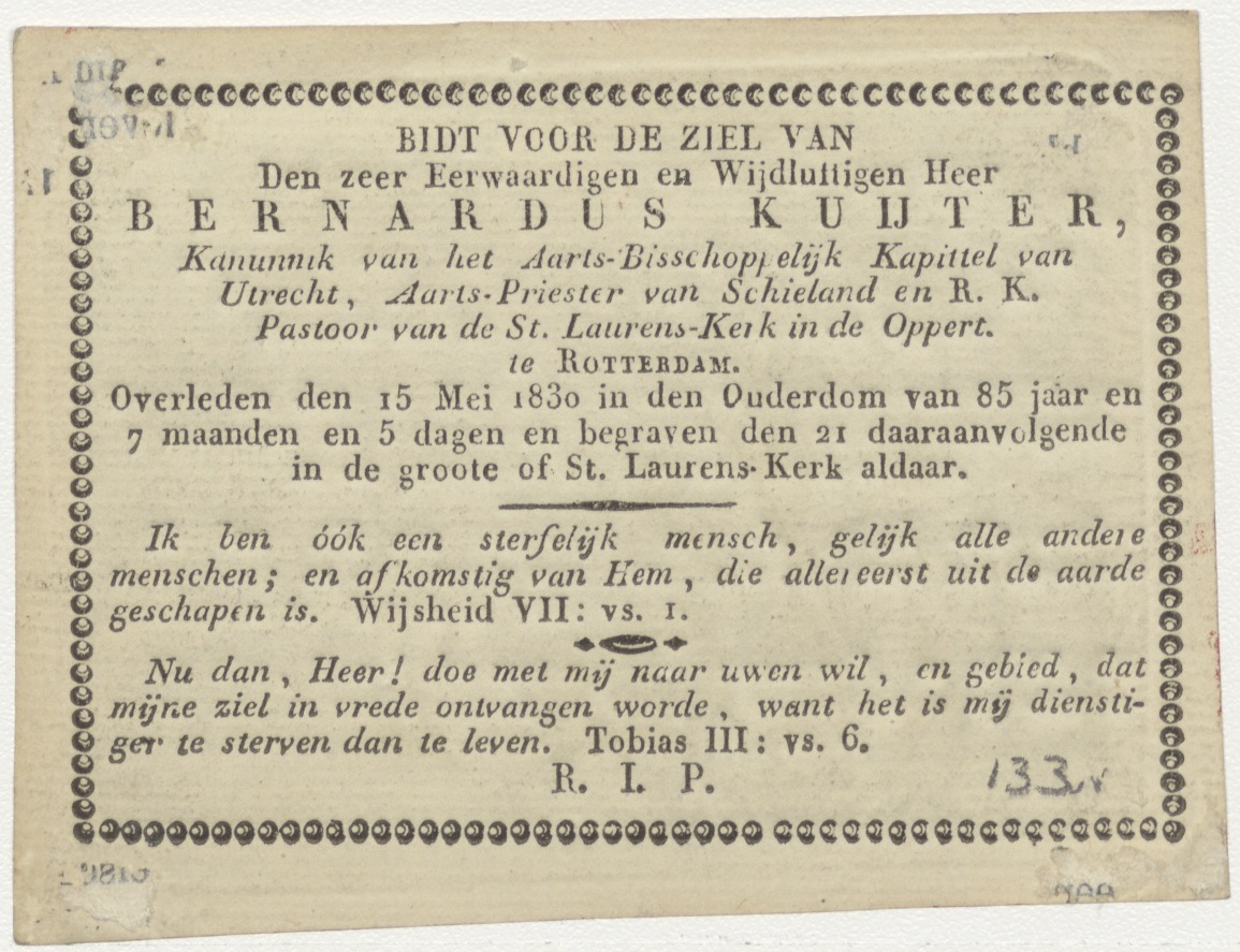 Maar verlos ons van het kwade, kz. Religieus; bid voor ziel Bernardus Kuijter (+1830) kanunnik Utrecht, pastoor St. Laurens Rotterdam