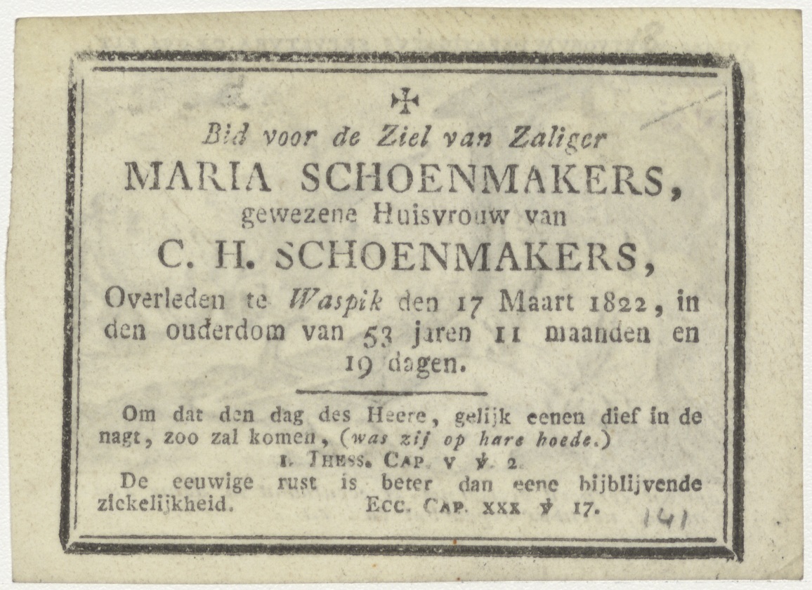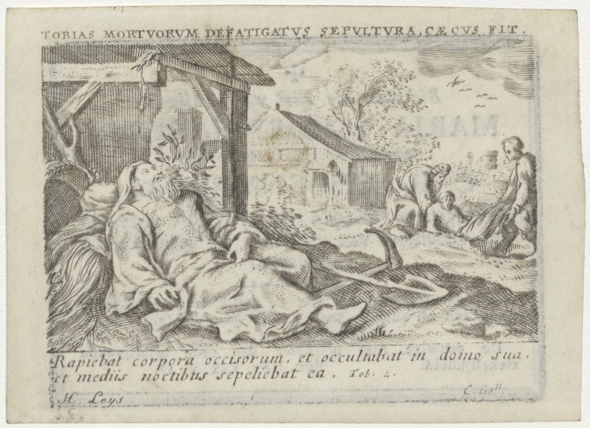 Tobias wordt blind, op de achtergrond begraaft hij de dode (Tob. 2), kz. Bid voor ziel Maria Schoenmakers (+1822) Waspik