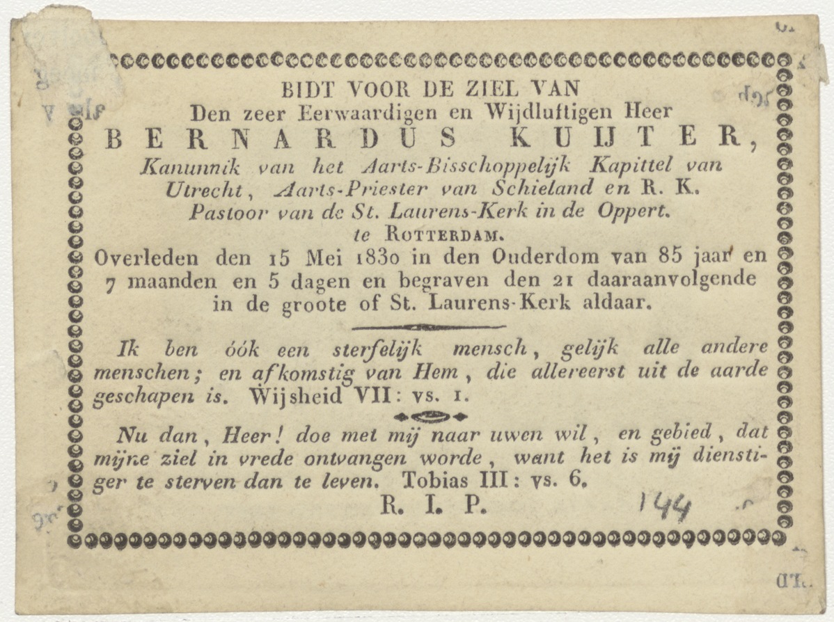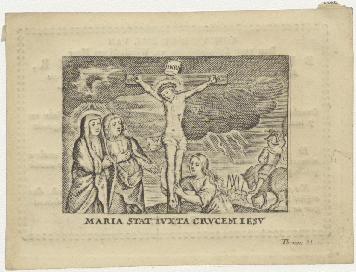 Gekruisigde Christus met Maria, Johannes en Maria Magdalena, kz. Religieus; bid voor ziel Bernardus Kuijter (+1830) pastoor St. Laurens de Oppert, Rotterdam