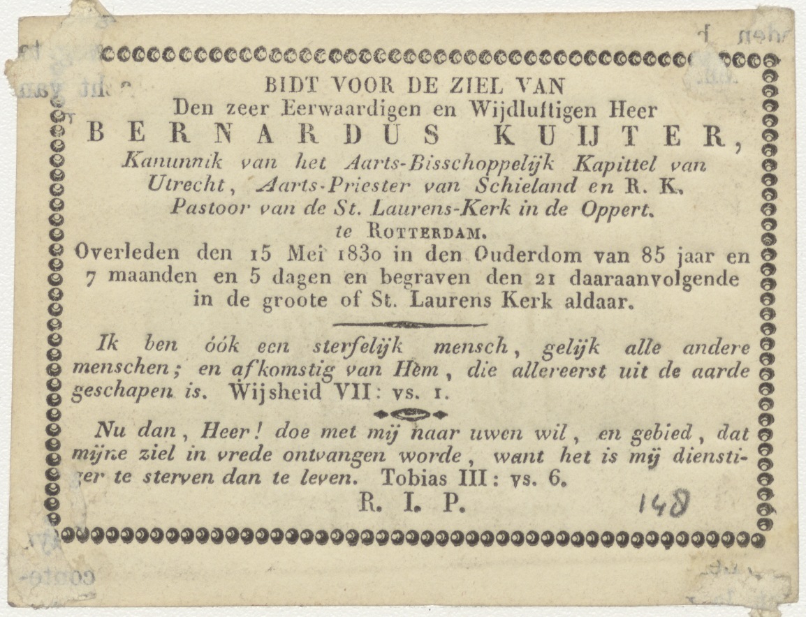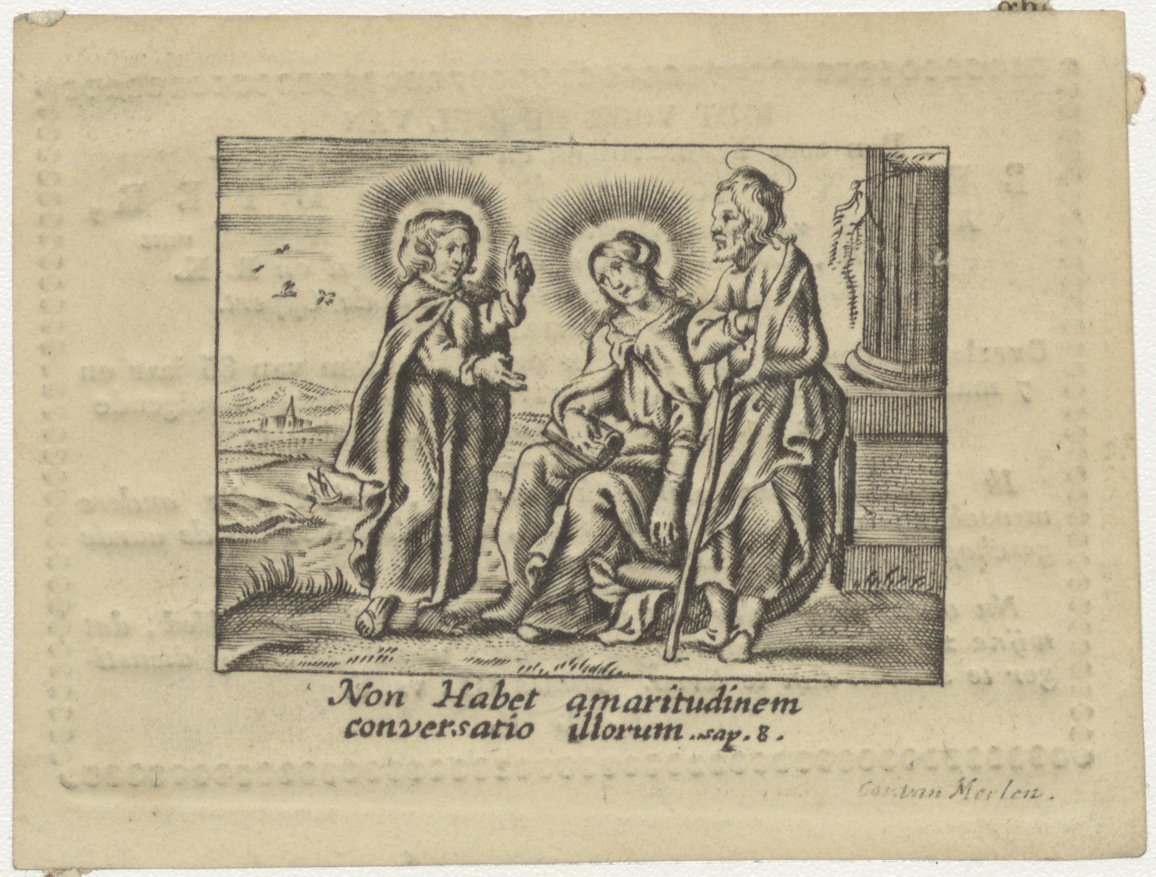 H. Familie, met "Non habet amaritudinem conversatio illorum sap. 8", kz. Religieus; bid voor ziel Bernardus Kuijter (+1830) kanunnik Utrecht, pastoor St. Laurens Rotterdam