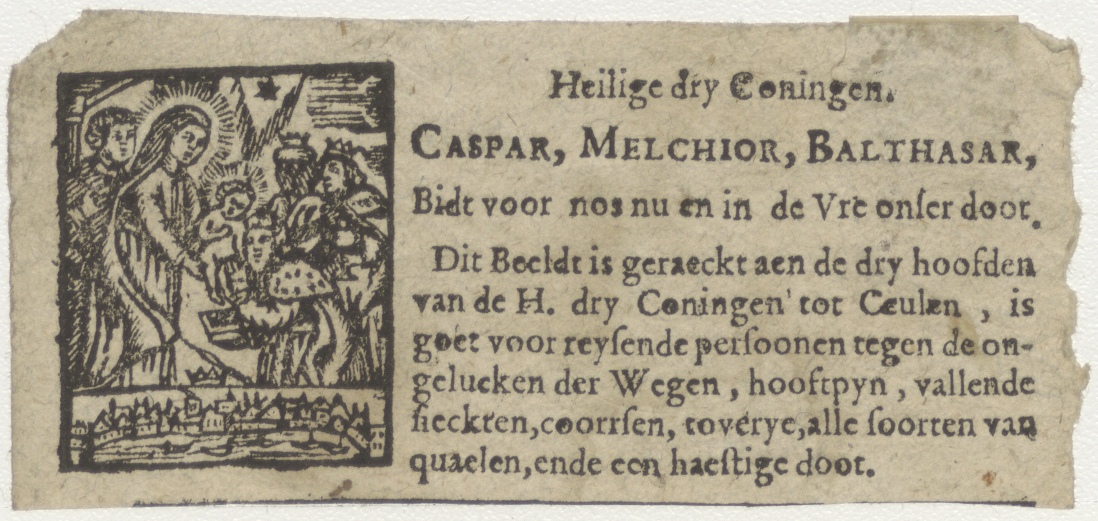 Keulen. aanbidding der koningen waaronder stadsgezicht met haven, met "Heilige dry Coningen. Caspar, Melchior, Balthasar, ..."